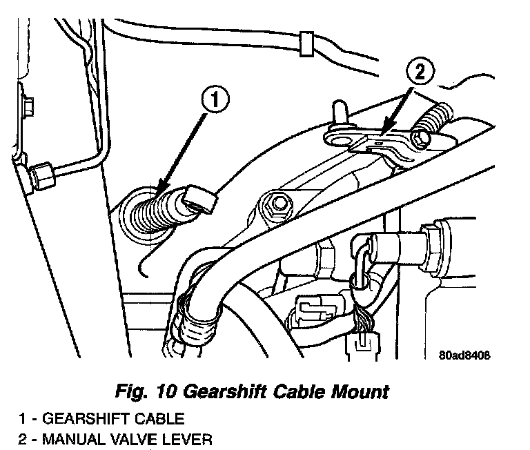 4. Disconnect gearshift cable clamp at transaxle. Disconnect cable grommet at manual valve lever (Fig. 10). Shift transaxle to neutral.