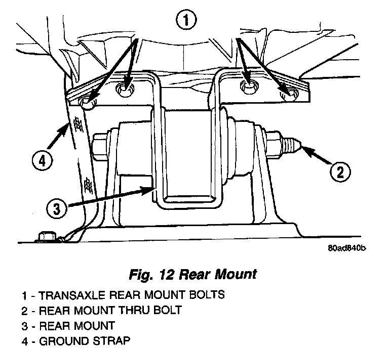 13. Remove transaxle rear mount bolts and mount thru bolt (Fig. 12). Remove mount.