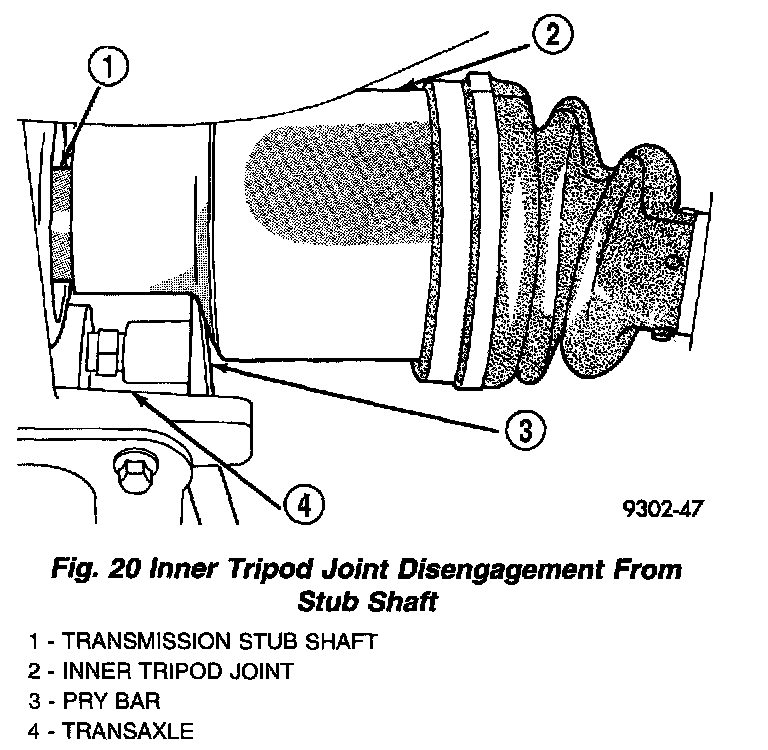 26. Dislodge inner tripod joint from stub shaft retaining snap ring on transaxle assembly (Fig. 20). Inner tripod joint is dislodged from stub shaft retaining snap ring, by inserting a pry bar between transaxle case and inner tripod joint and prying on tripod joint. Only disengage the inner tripod joint from the retaining snap ring. Do not attempt to remove the inner tripod joint from the transmission stub shaft at this time.