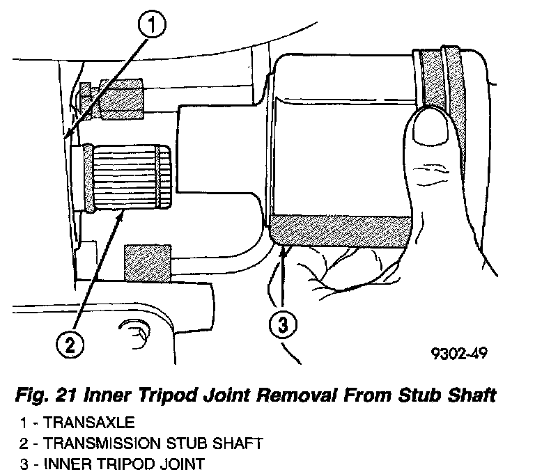 27. Remove halfshaft inner tripod joint from transaxle stub shaft. When removing halfshaft, do not pull on interconnecting shaft to remove inner tripod joint from stub shaft. Removal in this manner will separate the spider assembly from the tripod joint housing. Grasp inner tripod joint (Fig. 21) and interconnecting shaft and pull on both pieces at the same time.