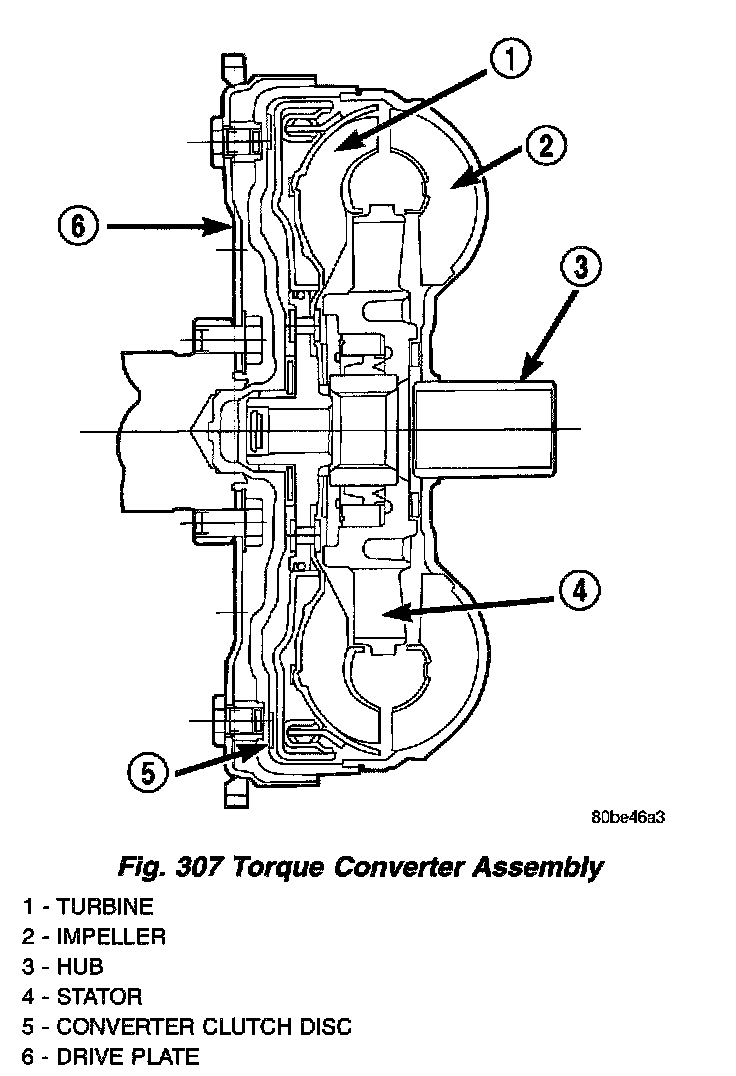 DESCRIPTIONThe torque converter is located in the bellhousing area of the transaxle, between the engine and transaxle. The torque converter is a fluid coupling that transmits torque from the engine drive plate to the input shaft of the transaxle. The torque converter consists of four main components (Fig. 307):
