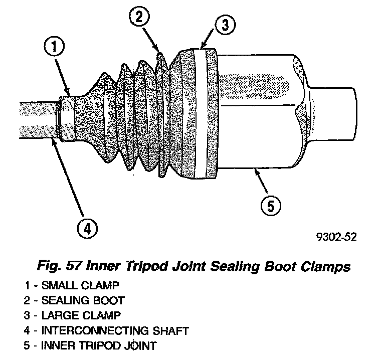 2. Remove large boot clamp which retains inner tripod joint sealing boot to tripod joint housing (Fig. 57) and discard. Remove small clamp which retains inner tripod joint sealing boot to interconnecting shaft and discard. Remove the sealing boot from the tripod housing and slide it down the interconnecting shaft.