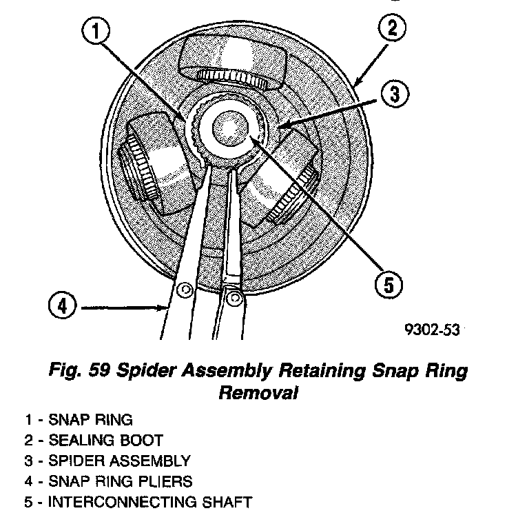4. Remove snap ring which retains spider assembly to interconnecting shaft (Fig. 59). Then remove the spider assembly from interconnecting shaft. If spider assembly will not come off interconnecting shaft by hand, it can be removed by tapping the end of the spider body with a brass drift. Do not hit the outer tripod bearings in an attempt to remove spider assembly from interconnecting shaft.