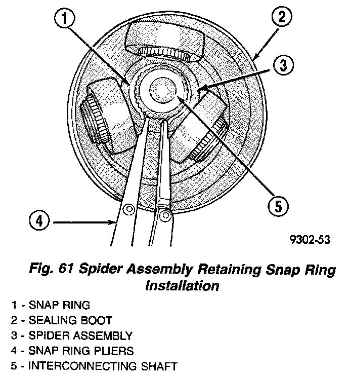 3. Install the spider assembly to interconnecting shaft retaining snap ring into groove on end of interconnecting shaft (Fig. 61). Verify the snap ring is fully seated into groove on interconnecting shaft.