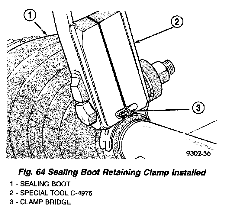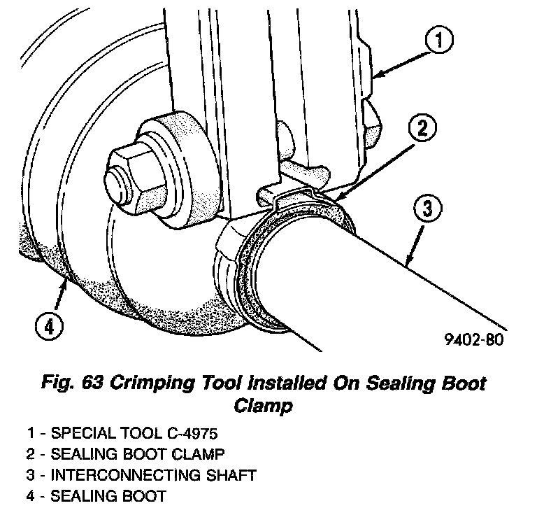 7. Clamp sealing boot onto interconnecting shaft using Crimper, Special Tool C-4975 and the following procedure. Place crimping tool C-4975 over bridge of clamp (Fig. 63). Tighten nut on crimping tool C-4975 until jaws on tool are closed completely together, face to face (Fig. 64).