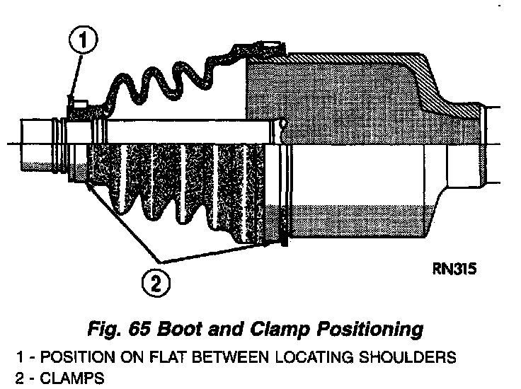 8. Position the sealing boot into the tripod housing retaining groove (Fig. 65). Install seal boot retaining clamp evenly on sealing boot.