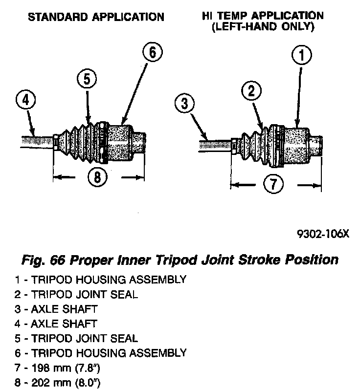9. Before crimping sealing boot to tripod housing clamp, the inner tripod joint must be at the correct stroke positioned (Fig. 66). This procedure is required to ensure that the proper amount of air is inside sealing boot before clamp is crimped. Failure to perform this operation will result in inner tripod sealing boot failure.