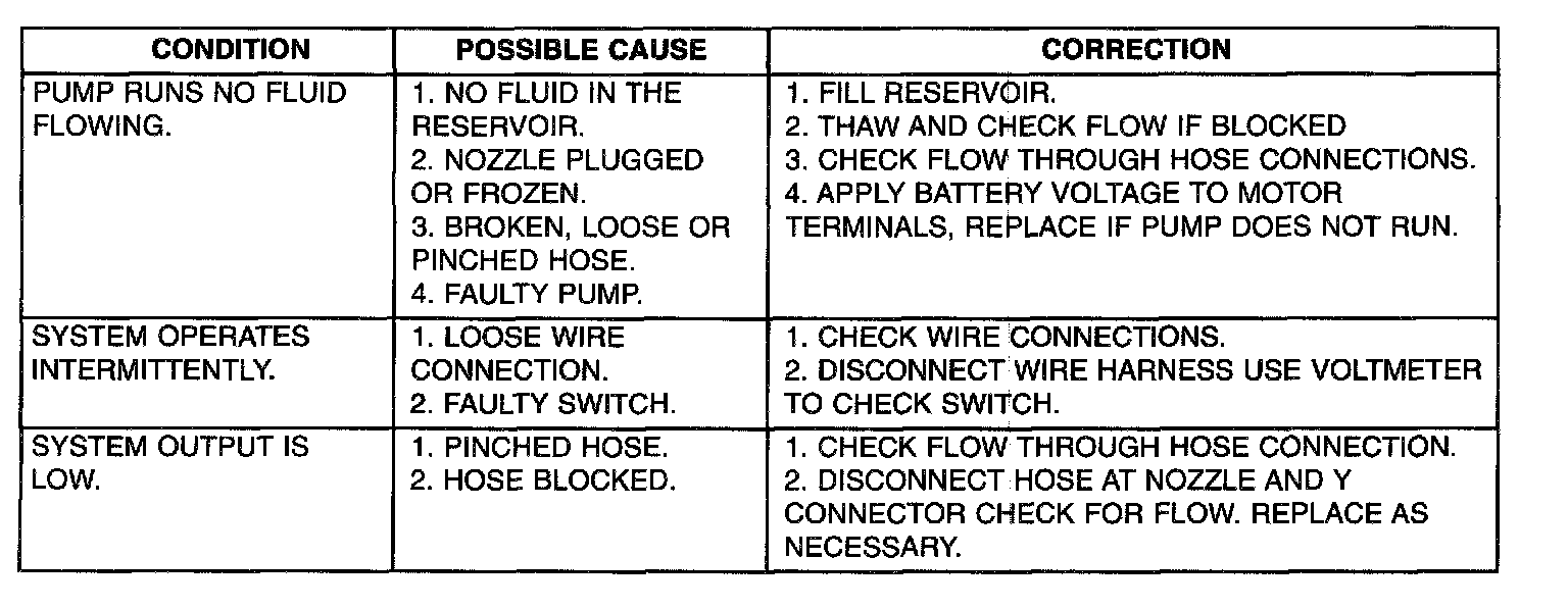 Whenever a windshield washer malfunction occurs, first verify that the windshield washer wire harness is properly connected to all connectors before starting normal diagnosis and repair procedures. Refer to table.