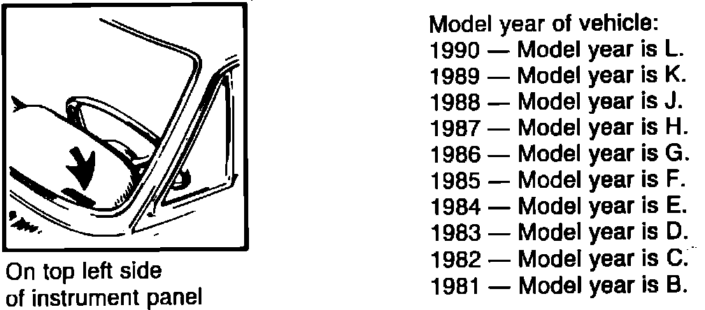 1 - MODEL YEAR IDENTIFICATION: Refer to illustrations of the Vehicle Identification Number (V.I.N.). The year is indicated by a code letter.