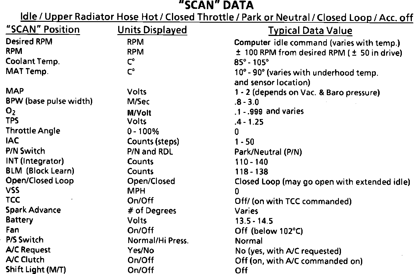 Scan Data Table (Typical Values):