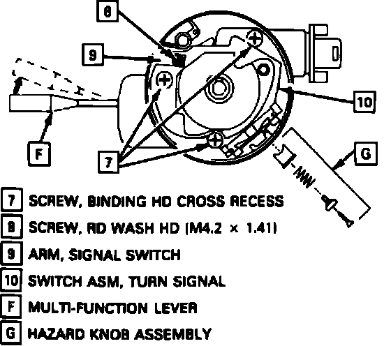 7. Remove turn signal switch attaching screws, then remove hazard knob assembly.