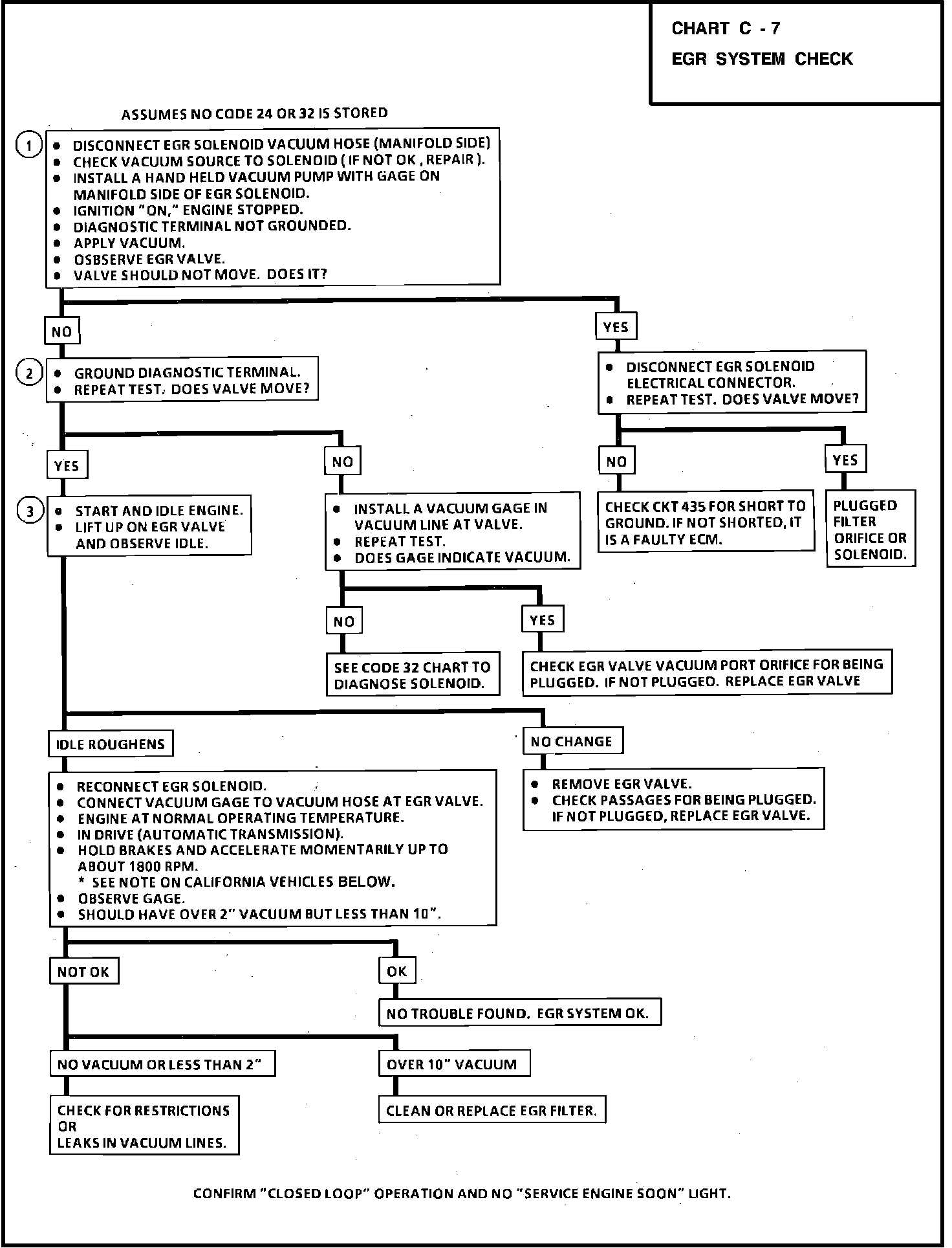 Code 32 will detect a faulty solenoid, vacuum supply, EGR Valve or plugged passage. This chart checks for plugged EGR passages, a sticking EGR valve, or a stuck open or inoperative solenoid.
