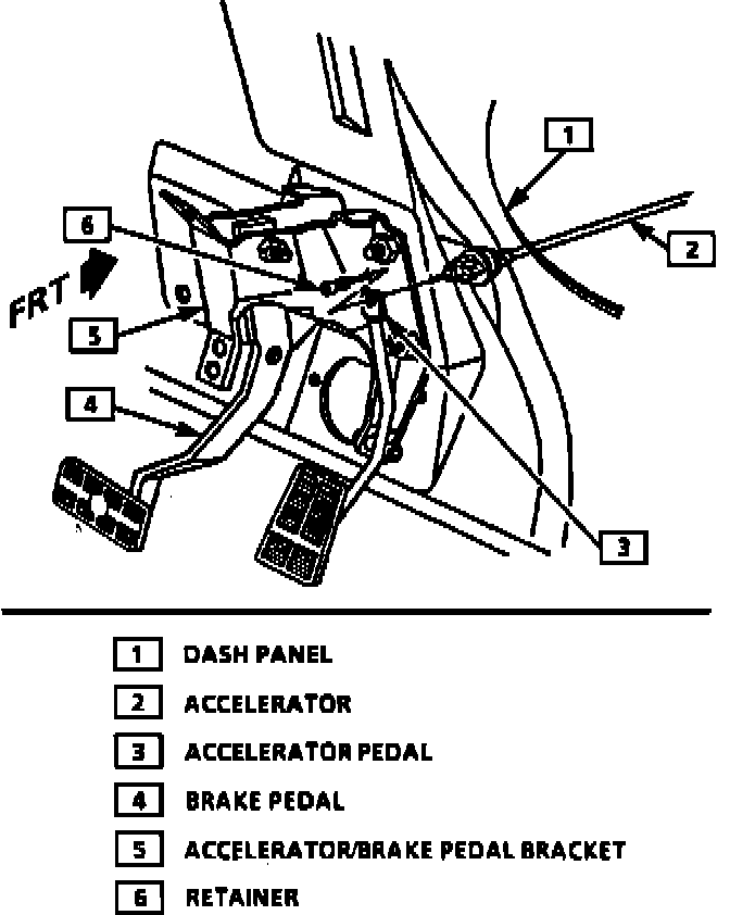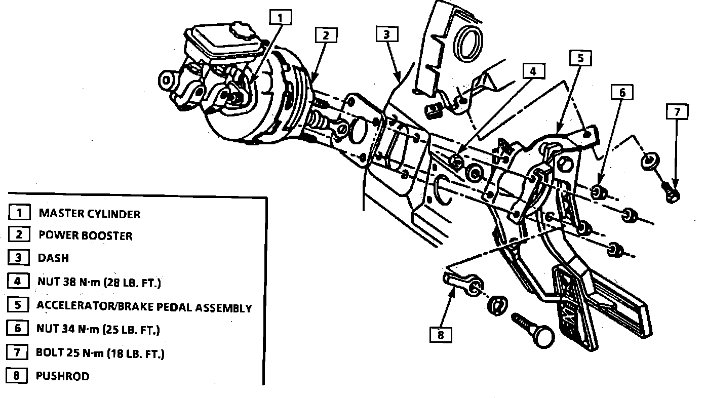 - Accelerator/brake pedal bracket. Tighten attaching nuts to 21 Nm (15 lb.ft.). Tighten attaching bolt to 25 Nm (18 lb.ft.)