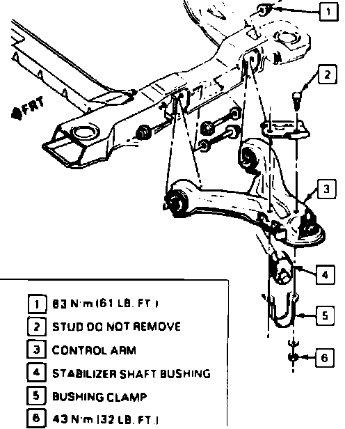 5. Torque stabilizer shaft bushing clamp nuts, control arm pivot bolt nut and ball joint pinch bolt nut to specifications.