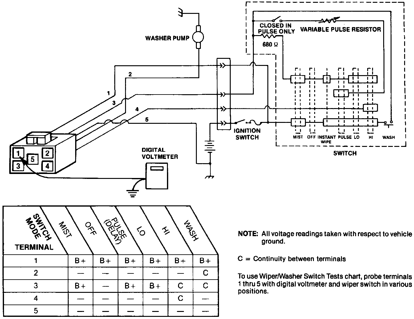 1. At fire wall, remove retaining clip to free wiper motor wiring harness, then disconnect wiring harness from wiper motor. Pull wiring harness toward front of vehicle for access. Perform the switch tests outlined. Use a digital voltmeter to probe harness connector terminals with ignition switch on.