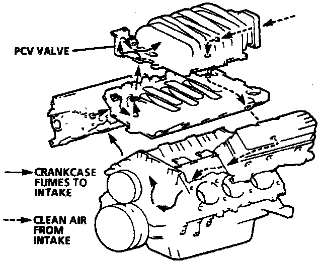 A Positive Crankcase Ventilation (PCV) system is used to consume crankcase vapors in the combustion process instead of venting to atmosphere. Fresh air from the throttle body is supplied to the crankcase, mixed with blow-by gases and then passed through a Positive Crankcase Ventilation (PCV) valve into the intake manifold.