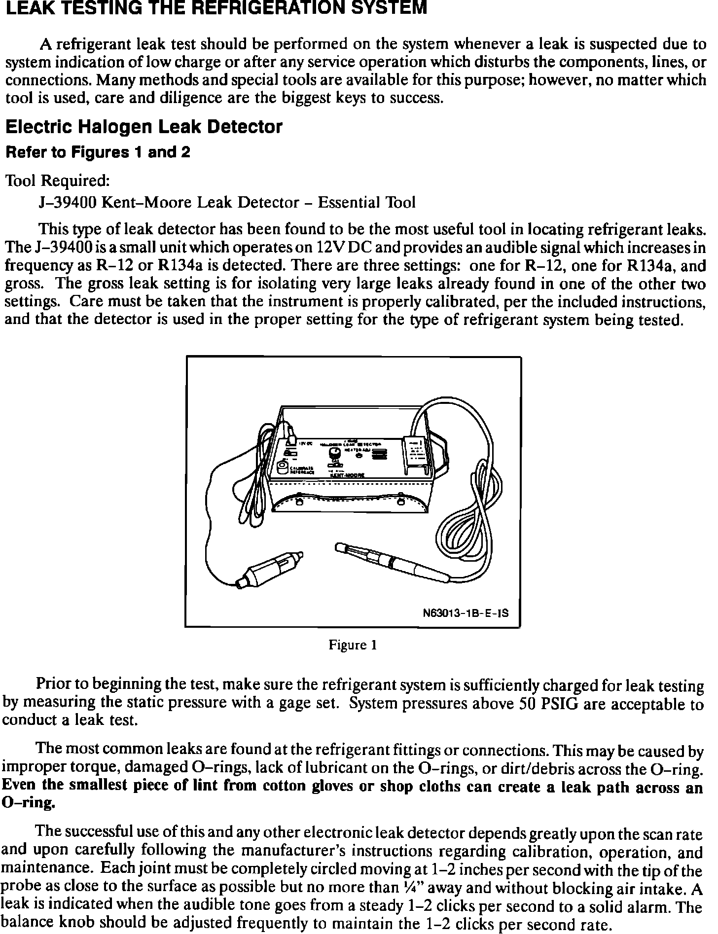 This type of leak detector has been found to be the most useful tool in locating refrigerant leaks. The J-39400 is a small unit which operates on 12V DC and provides an audible signal which increases in frequency as R-12 or R-134a is detected. There are three settings: one for R-12, one for R-134a, and gross. The gross leak setting is for isolating very large leaks already found in one of the other two settings. Care must be taken that the instrument is properly calibrated, per the included instructions, and that the detector is used in the proper setting for the type of refrigerant system being tested.