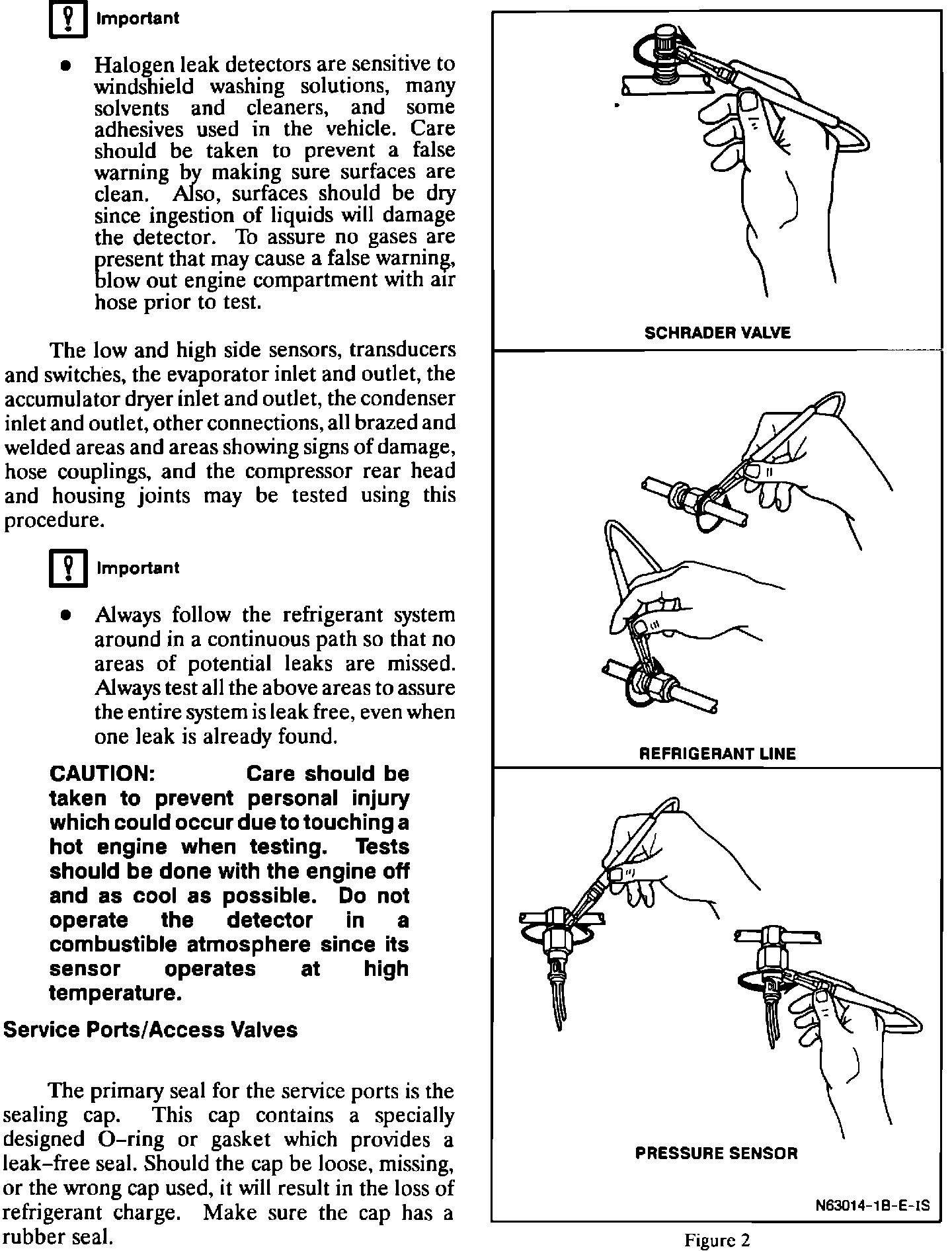 ^ Halogen leak detectors are sensitive to windshield washing solutions, many solvents and cleaners, and some adhesives used in the vehicle. Care should be taken to prevent a false warning by making sure surfaces are clean. Also, surfaces should be dry since ingestion of liquids will damage the detector. To assure no gases are present that may cause a false warning, blow out engine compartment with air hose prior to test.