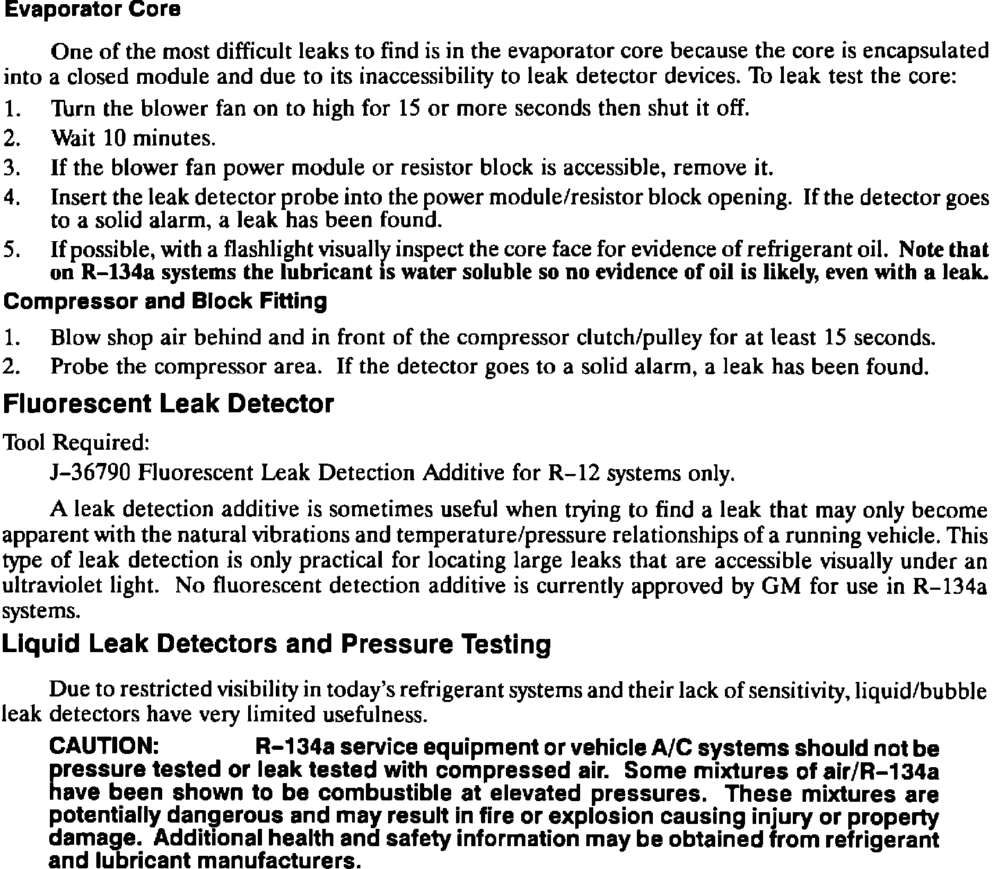 A leak detection additive is sometimes useful when trying to find a leak that may only become apparent with the natural vibrations and temperature/pressure relationships of a running vehicle. This type of leak detection is only practical for locating large leaks that are accessible visually under an ultraviolet light. No fluorescent detection additive is currently approved by GM for use in R-134a systems.