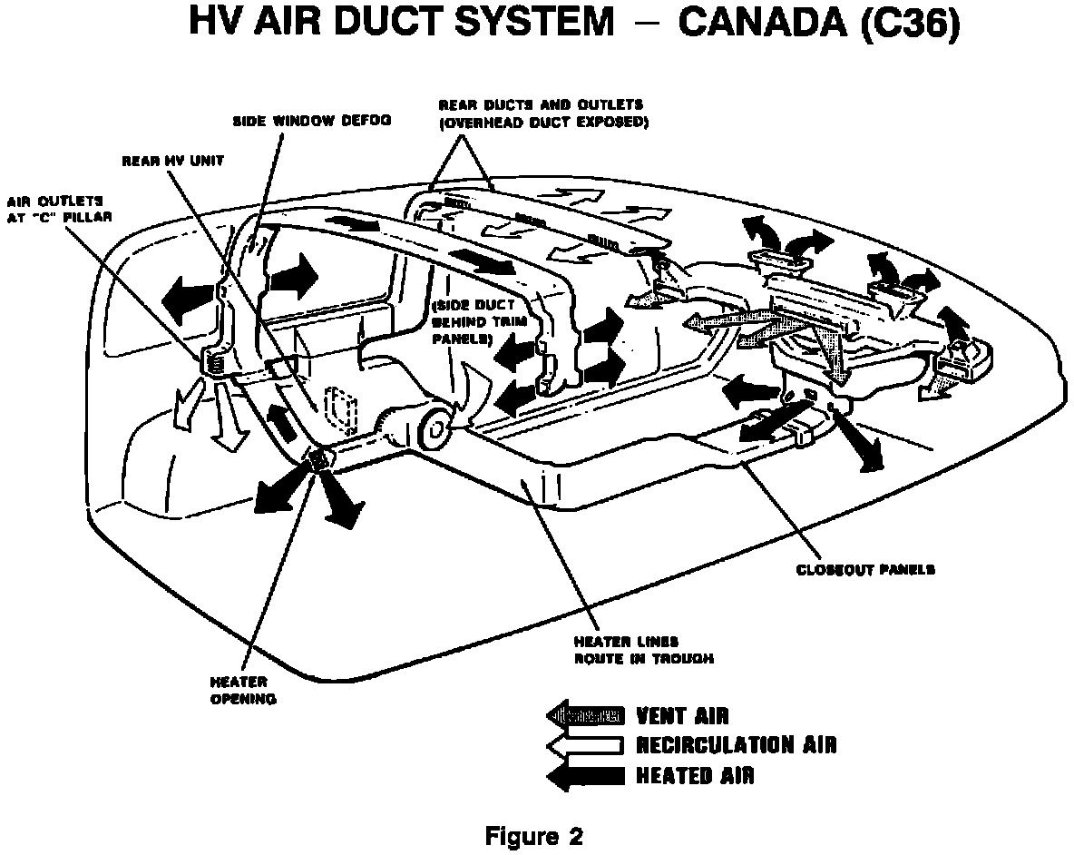 This system is now base equipment on all Canadian vehicles with 7 passenger seating. It was developed to provide rear heat without the additional cost of rear A/C, which many Canadian customers find unnecessary. It is capable of providing heated air to the floor and rear side windows. It is capable of providing recirculated air only (not heated or cooled) through the overhead outlets and the third row side outlet. The distribution mode automatically parallels the mode selected on the front unit but with separate fan control. (C36 is identical to C34 except for the removal of the rear A/C evaporator.) See Figure 2.