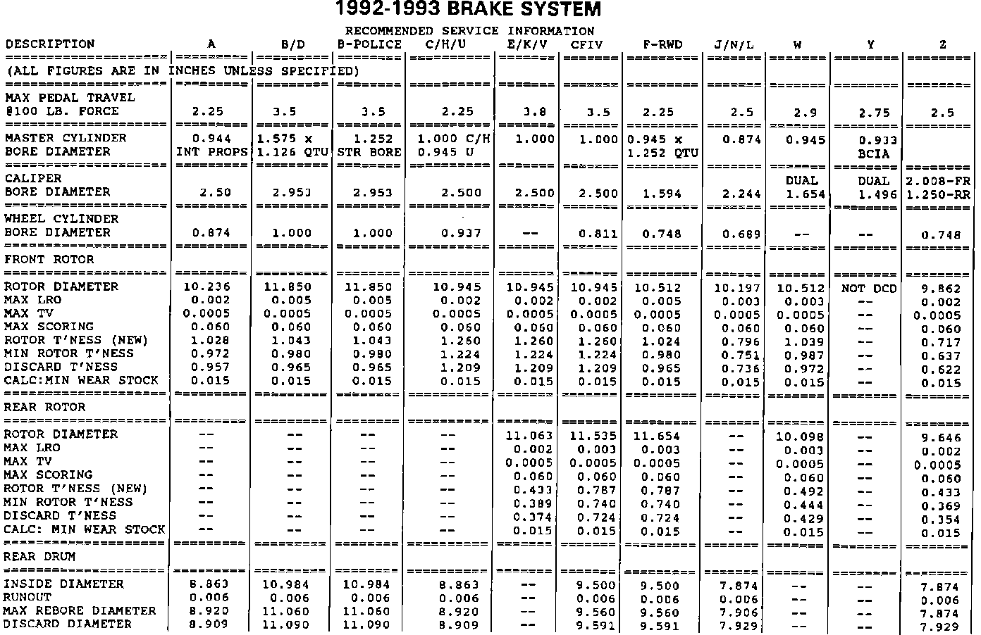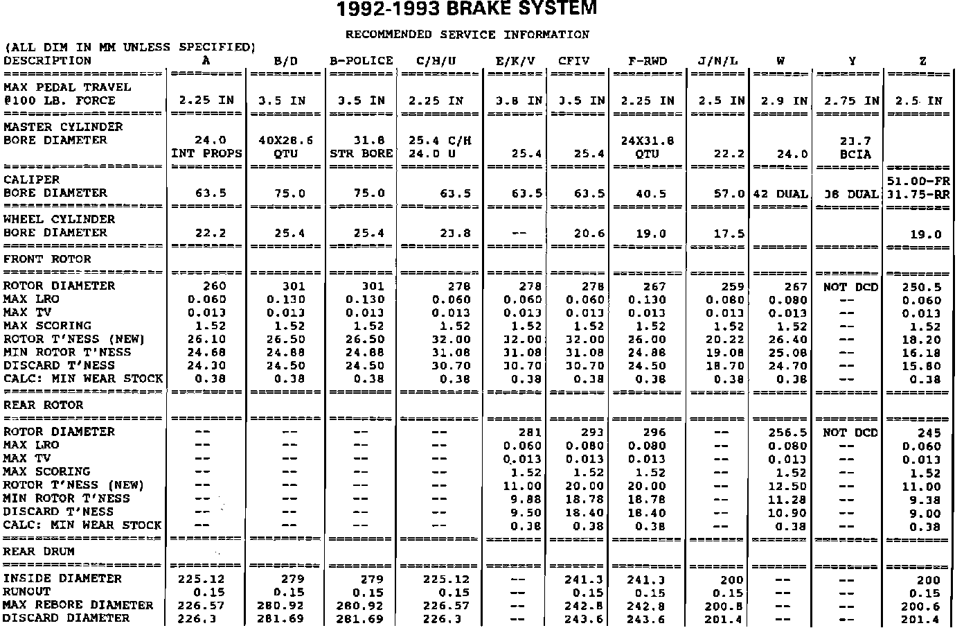 SERVICE MANUAL UPDATE - SECTION 5 - BRAKE SERVICE SPECIFICATIONS