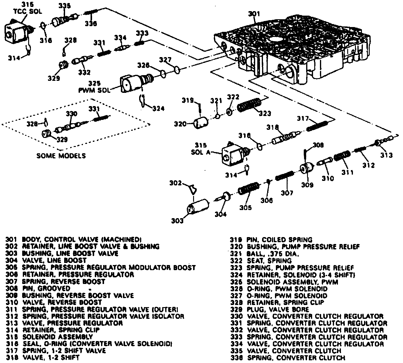 168. Remove pivot pin, roll pin, then the 3-2 coast down valve, spring and bore plug.