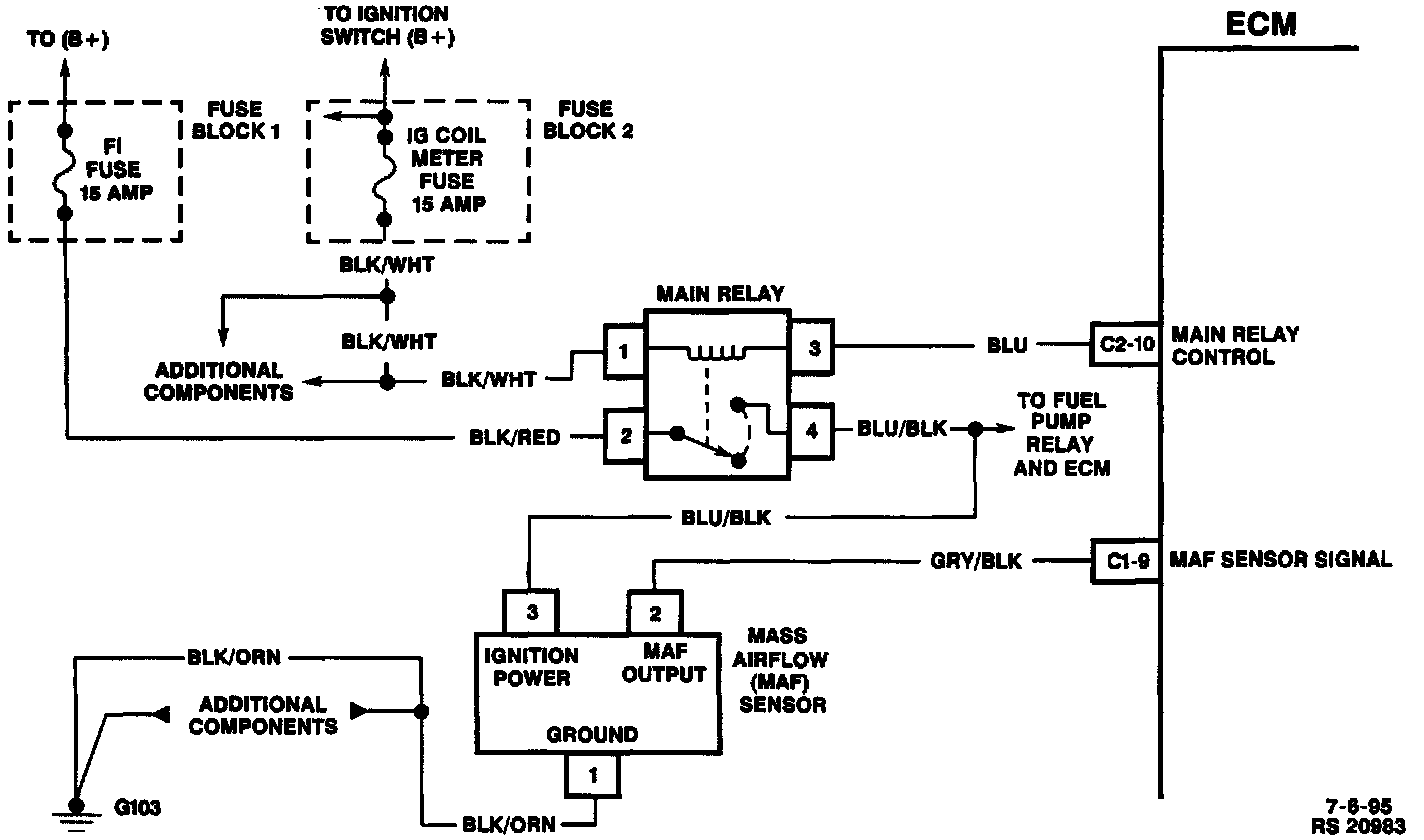 The Mass Air Flow (MAF) sensor measures the amount of air which passes through it in a given amount of time. The Engine Control Module (ECM) uses this information to determine the operating conditions of the engine to control fuel delivery. A large quantity of air movement indicates acceleration, while a small quantity indicates deceleration or idle. As the amount of air entering the sensor increases, then so does the sensor signal current to the ECM. As air flow decreases, then so does the signal current to the ECM. The MAF sensor is located between the air intake tube and the air cleaner in the LH front engine compartment.