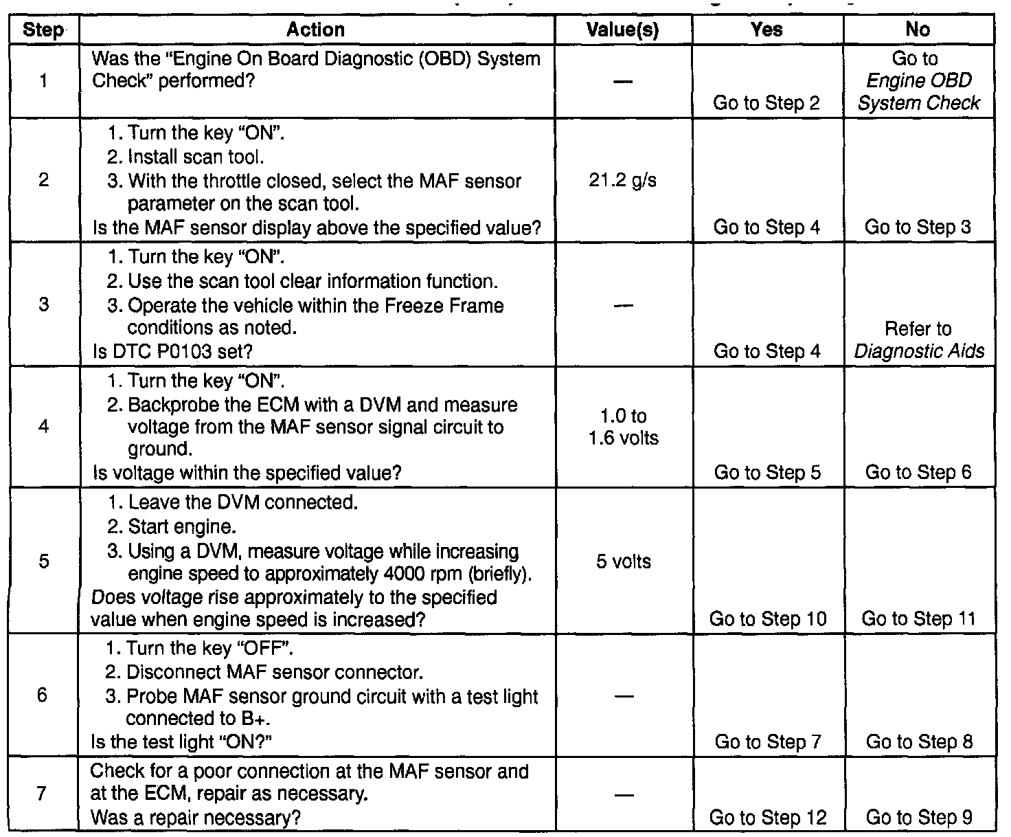 If DTC P0103 cannot be duplicated, the information included in the Freeze Frame data can be useful in determining vehicle operating conditions when the DTC was first set.