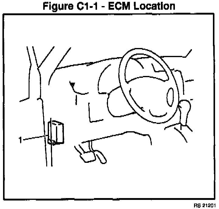 The Engine Control Module (ECM) is a precision unit consisting of a one chip microcomputer, Analog/Digital (A/D) converter and an Input/Output (I/O) unit. It is an essential part of the electronic control system, for its functions include not only such major functions as to control the fuel injector, Idle Air Control (IAC) valve, fuel pump relay, etc., but also a self-diagnosis function and a fail-safe function as described in the following section. The ECM is installed below the instrument panel left of the steering column.