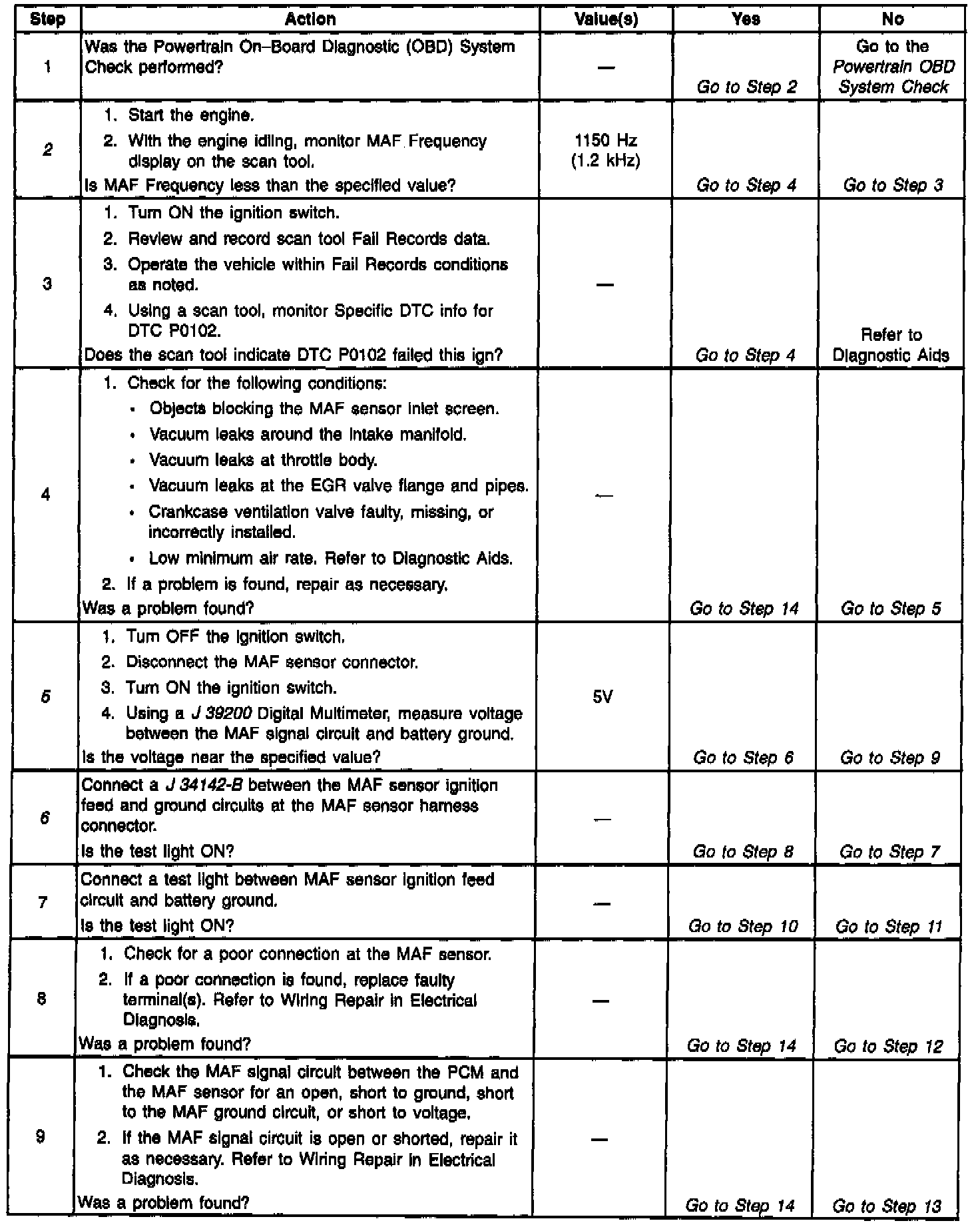 The Mass Air Flow (MAF) sensor measures the amount of air which passes through it into the engine during a given time. The PCM uses the mass air flow information to monitor engine operating conditions for fuel delivery calculations. A large quantity of air entering the engine indicates an acceleration or high load situation, while a small quantity of air indicates deceleration or idle. The MAF sensor produces a frequency signal which can be monitored using a scan tool. The frequency will vary within a range of around 2000 Hertz at idle to about 10,000 Hertz at maximum engine load. DTC P0102 will be set if the signal frequency from the MAF sensor is lower than the possible range of a normally operating MAF sensor.
