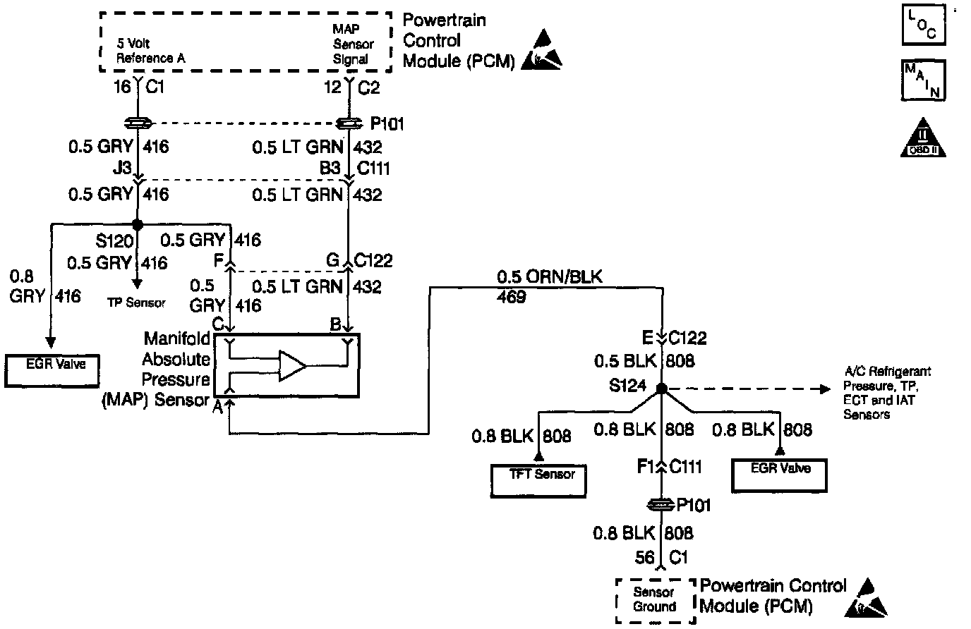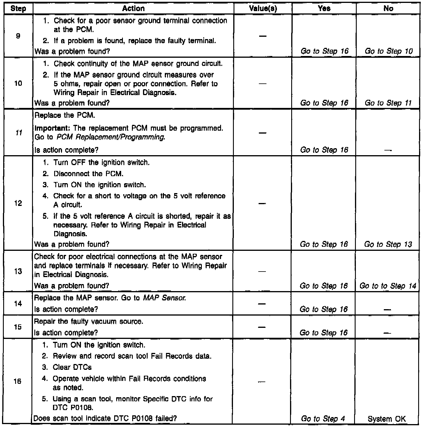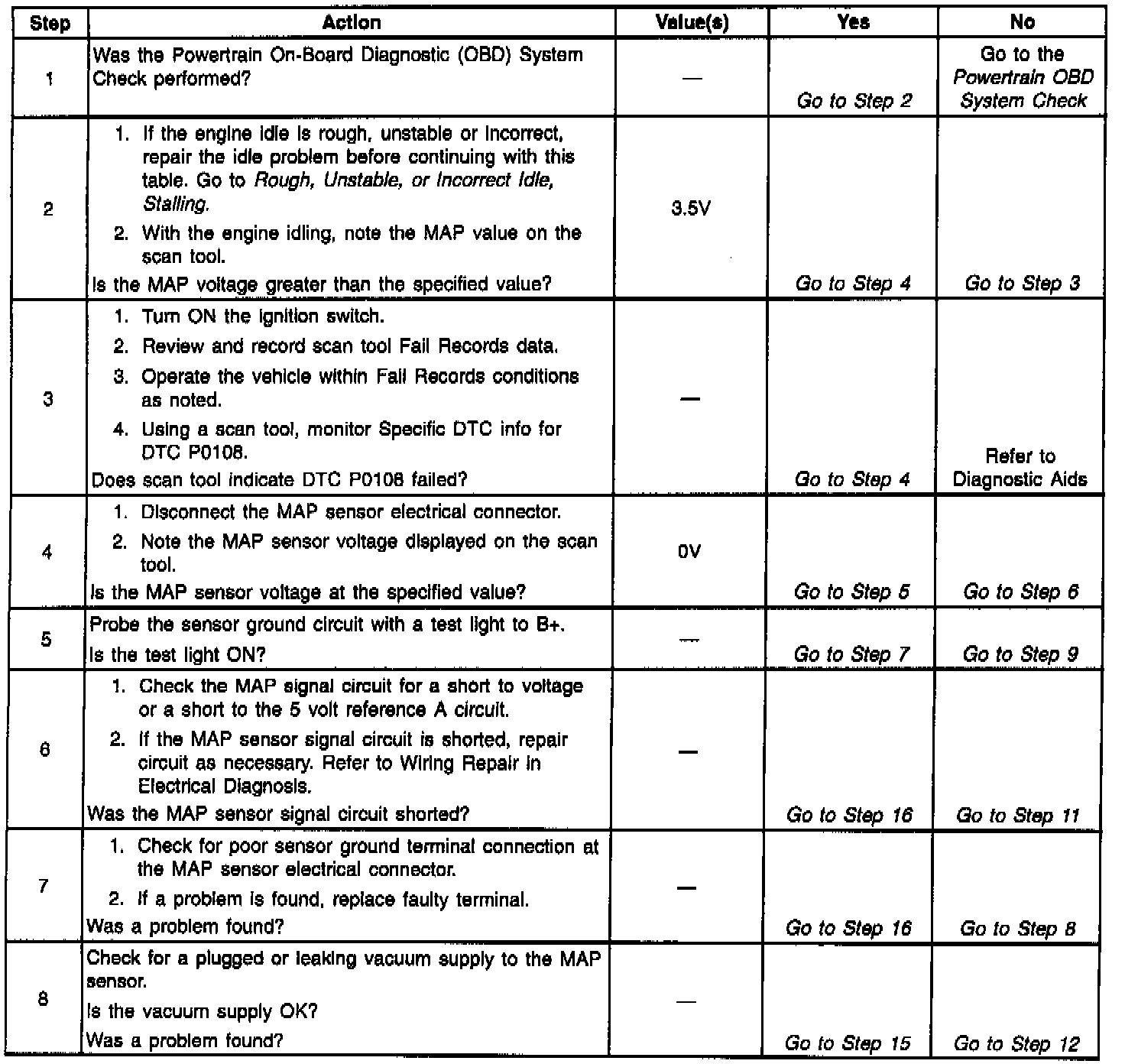 The Manifold Absolute Pressure (MAP) sensor responds to changes in intake manifold pressure (vacuum). The MAP sensor signal voltage to the PCM varies from below 2 volts at idle (high vacuum) to above 4 volts with the key ON, engine not running or at wide-open throttle (low vacuum). The MAP sensor is used to determine manifold pressure changes while the linear EGR flow test diagnostic is being run (refer to DTC P0401), to determine engine vacuum level for some other diagnostics and to determine barometric pressure (BARO). The PCM monitors the MAP signals for voltages outside the normal range of the MAP sensor. If the PCM detects a MAP signal voltage that is excessively high, DTC P0108 will be set.