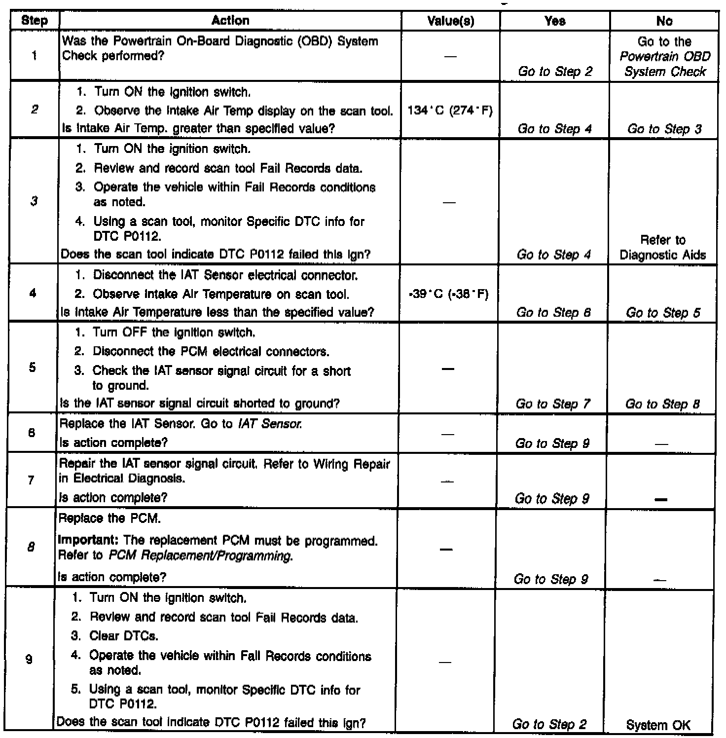 3. If DTC P0112 can be repeated only by duplicating the Fail Records conditions, refer to the Temperature Vs. Resistance Values Table. The table may be used to test the IAT sensor at various temperatures to evaluate the possibility of a shifted sensor that may be shorted above or below a certain temperature. If this is the case, replace the IAT sensor. If the IAT sensor appears to be OK, the fault is intermittent; refer to Diagnostic aids.