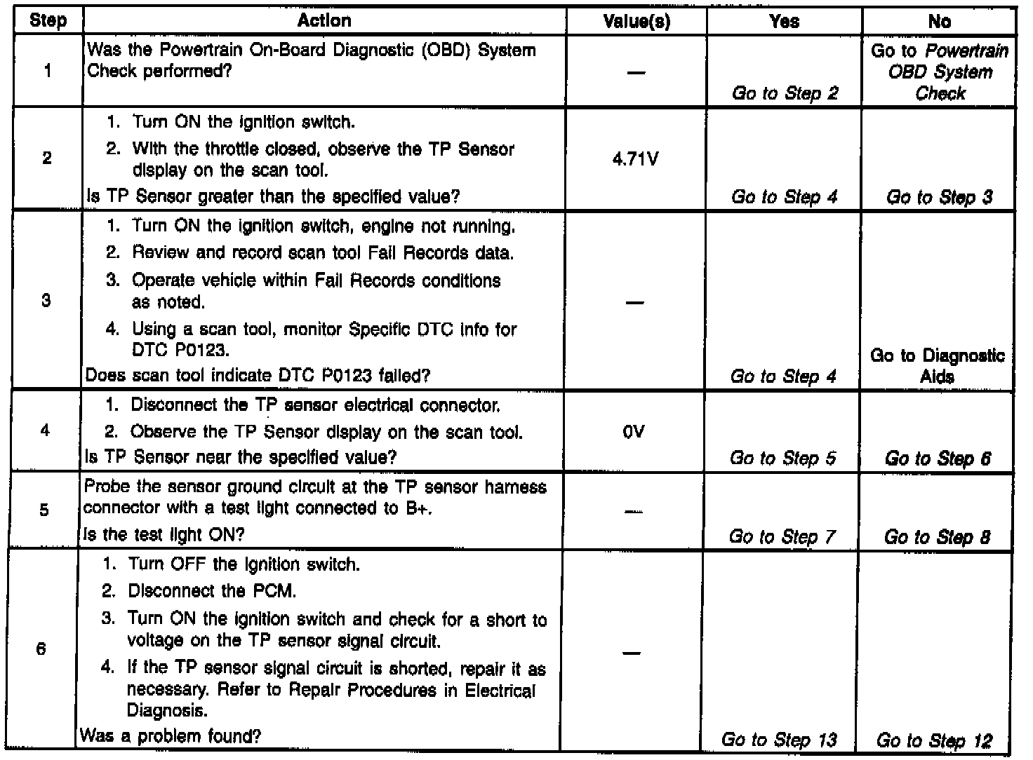 The Throttle Position (TP) sensor circuit provides a voltage signal that changes relative to throttle blade angle. The signal voltage will vary from below 1 volt at closed throttle to about 4 volts at Wide Open Throttle (WOT). The TP signal is one of the most important inputs used by the PCM for fuel control and most of the PCM-controlled outputs. DTC P0123 will set when the PCM detects an excessively high signal voltage on the throttle position sensor signal circuit.