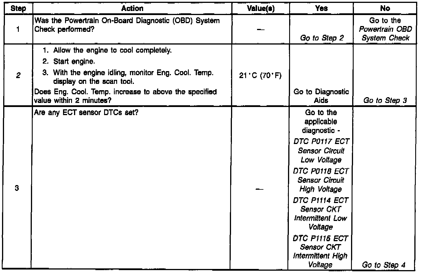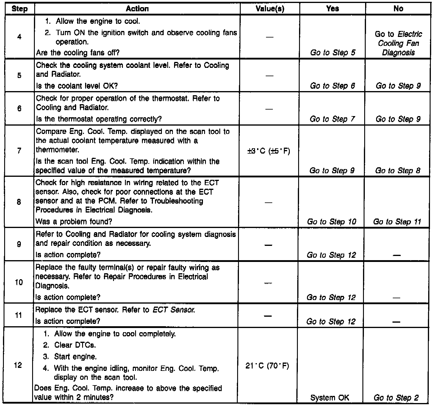 - Check for high resistance in wiring related to the ECT sensor. Also, check for poor connections at ECT sensor and PCM. Refer to Troubleshooting Procedures in Electrical Diagnosis.