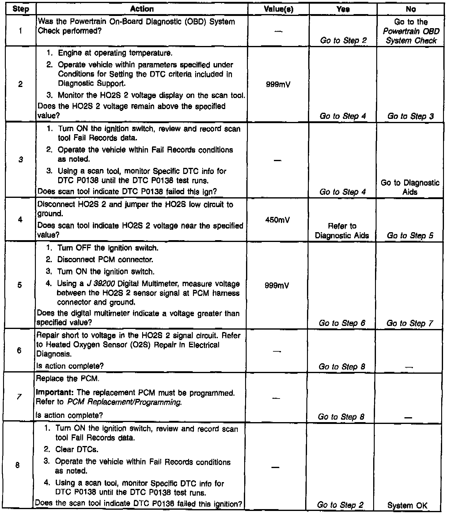 The PCM supplies a bias voltage of about 450 mV between the HO2S signal and low circuits. When measured with a 10 megohm digital voltmeter, this may display as low as 320 mV. The oxygen sensor varies the voltage within a range of about 1000 mV when the exhaust is rich, down through about 10 mV when exhaust is lean. The PCM constantly monitors the HO2S signal during closed loop operation and compensates for a rich or lean condition by decreasing or increasing injector pulse width as necessary. If the HO2S 2 voltage remains excessively high for an extended period of time, DTC P0138 will be set.
