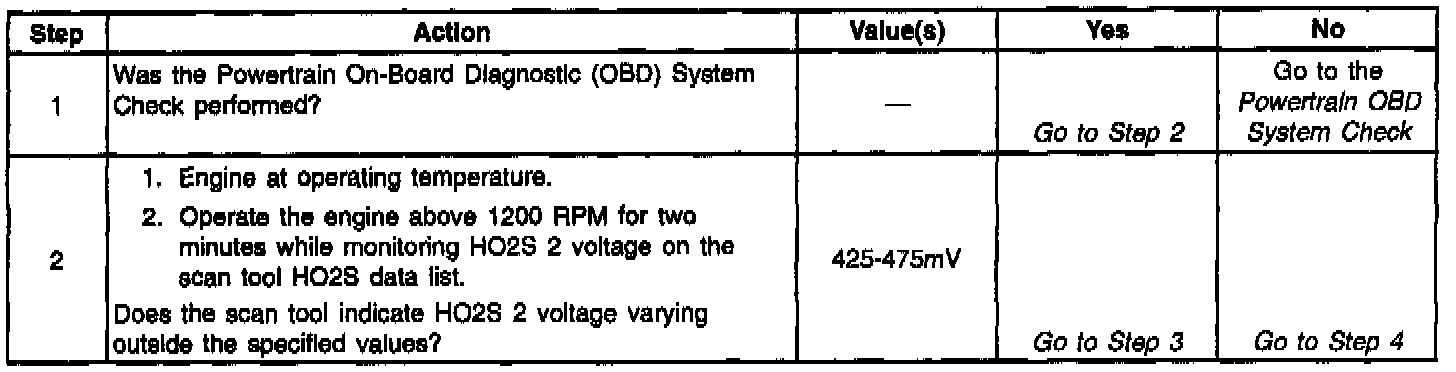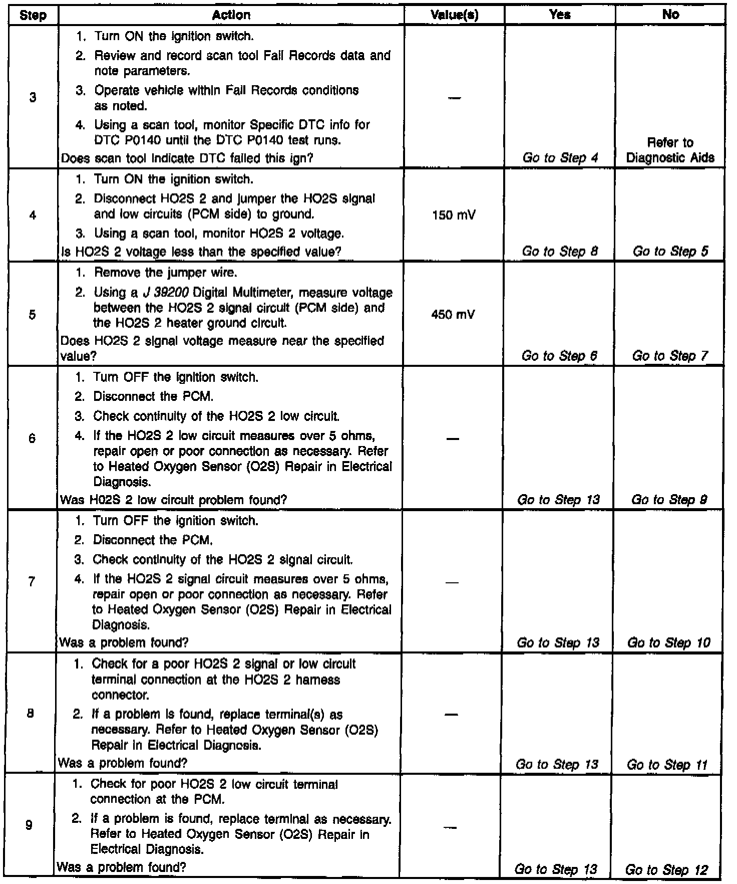 The PCM supplies a bias voltage of about 450 mV between the HO2S signal and low circuits. When measured with a 10 megohm digital voltmeter, this may display as low as 320 mV. The oxygen sensor varies the voltage within a range of about 1000 mV when the exhaust is rich, down through about 10 mV when exhaust is lean. The PCM constantly monitors the HO2S signal during closed loop operation and compensates for a rich or lean condition by decreasing or increasing injector pulse width as necessary. If the HO2S 2 voltage remains at or near the 450 mV bias for an extended period of time, DTC P0140 will be set, indicating an open sensor signal or sensor low circuit.