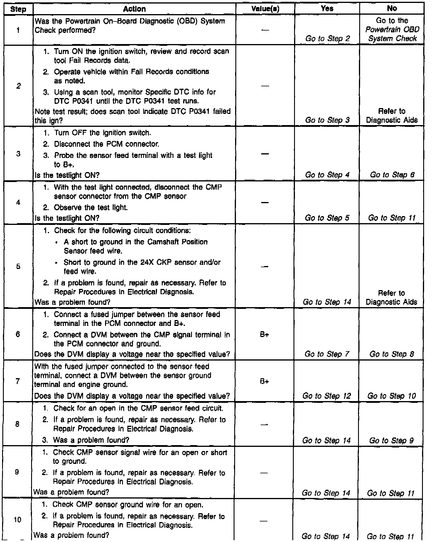 - Damaged harness. Inspect the wiring harness for damage. If the harness appears to be OK, disconnect the PCM, turn the ignition ON and observe a voltmeter connected to the CAM signal circuit at the PCM harness connector while moving connectors and wiring harnesses related to the 24X Crankshaft Position Sensor and Camshaft Position Sensor. The Camshaft Position and 24X sensors share the same sensor feed from the PCM. A change in voltage will indicate the location of the fault.