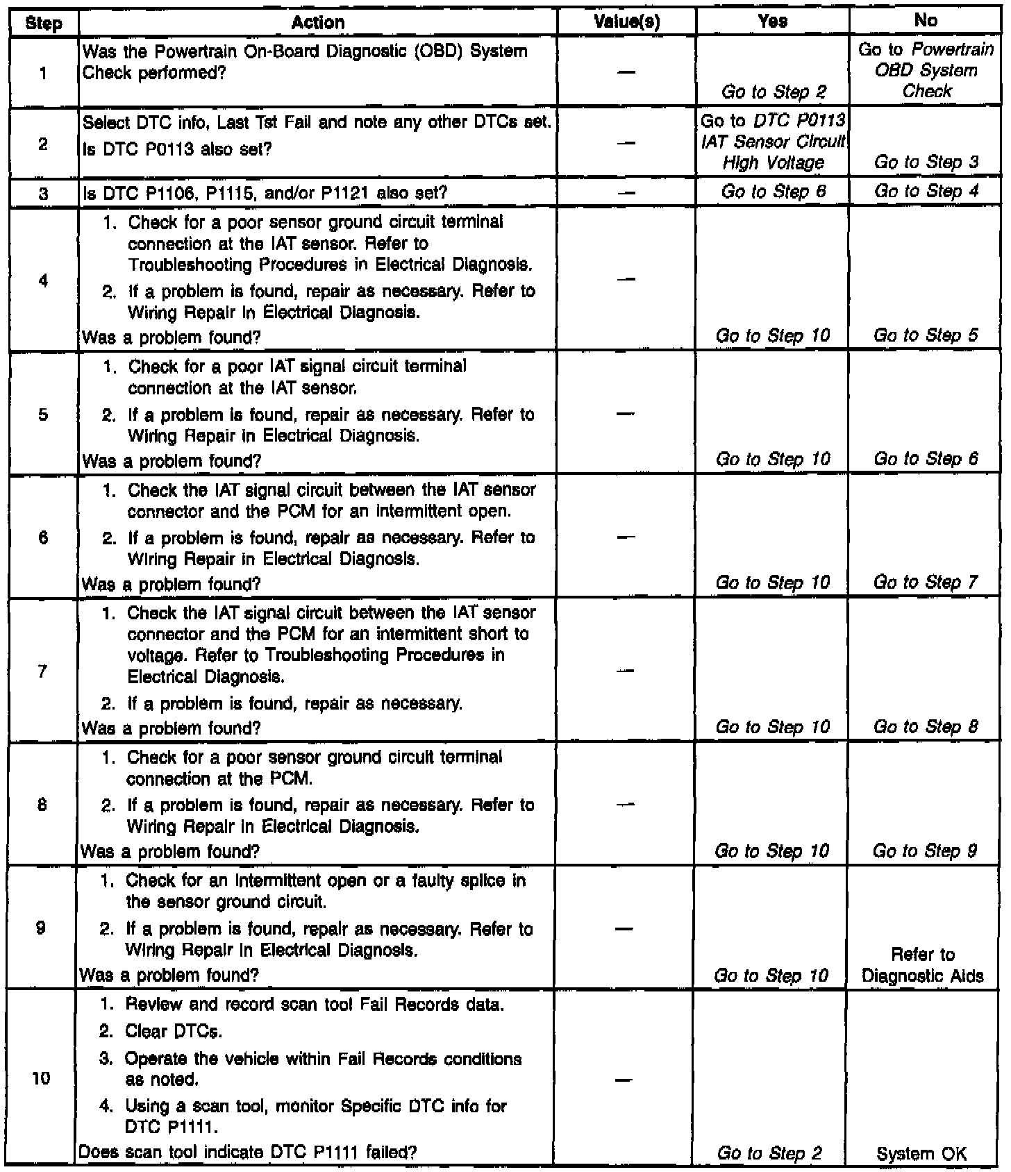 The Intake Air Temperature (IAT) sensor is a thermistor which measures the temperature of the air entering the engine. The PCM applies 5 volts through a pull-up resistor to the IAT sensor. When the intake air is cold, the sensor resistance is high and the PCM will monitor a high signal voltage on the IAT signal circuit. If the intake air is warm, the sensor resistance is lower causing the PCM to monitor a lower voltage. DTC P1111 will set when the PCM detects an intermittently high signal voltage on the intake air temperature sensor signal circuit.