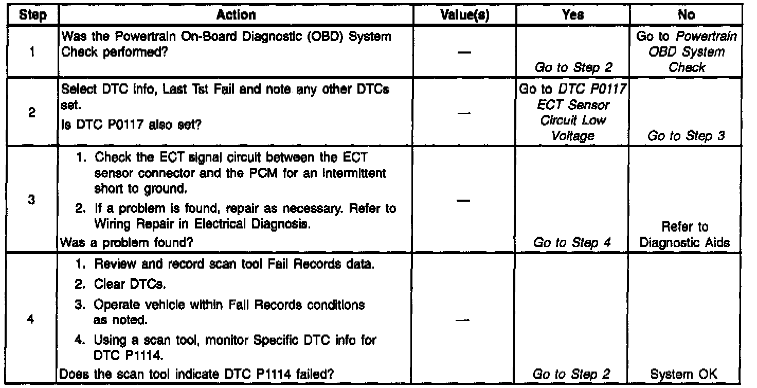 The Engine Coolant Temperature (ECT) sensor is a thermistor mounted in the engine coolant stream. The PCM applies a voltage (about 5.0 volts) through a pull up resistor to the ECT signal circuit. When the engine coolant is cold, the sensor (thermistor) resistance is high, therefore the PCM will measure a high signal voltage. As the engine coolant warms, the sensor resistance becomes less, and the ECT signal voltage measured at the PCM drops. With a fully warmed up engine, the ECT signal voltage should measure about 1.5 to 2.0 volts. It the PCM detects an ECT signal that is intermittently below the range of the ECT sensor, DTC P1114 will set.
