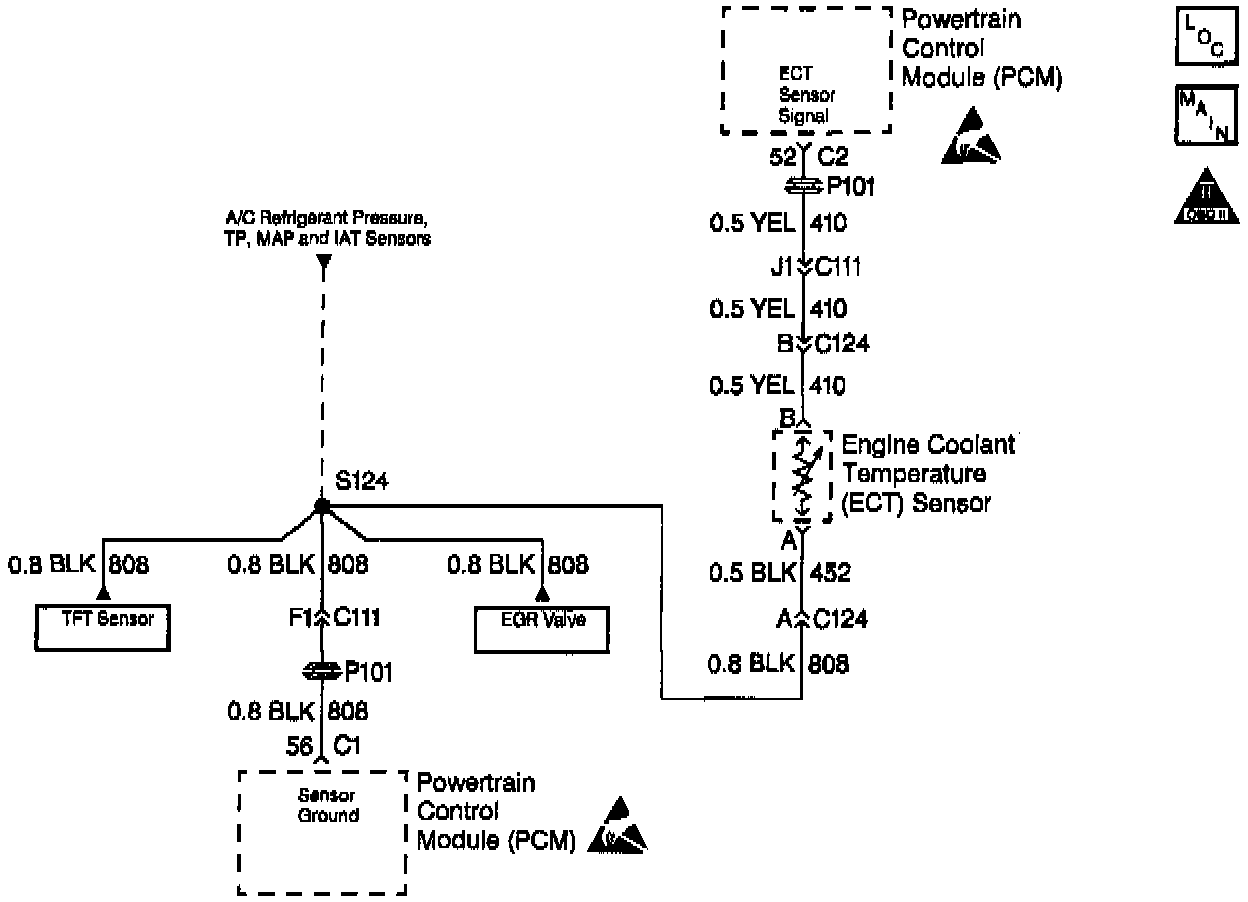 - Damaged harness. Inspect the wiring harness for damage. If the harness appears to be OK, observe the ECT display on the scan tool while moving connectors and wiring harnesses related to the ECT sensor. A change in the ECT display will indicate the location of the fault.