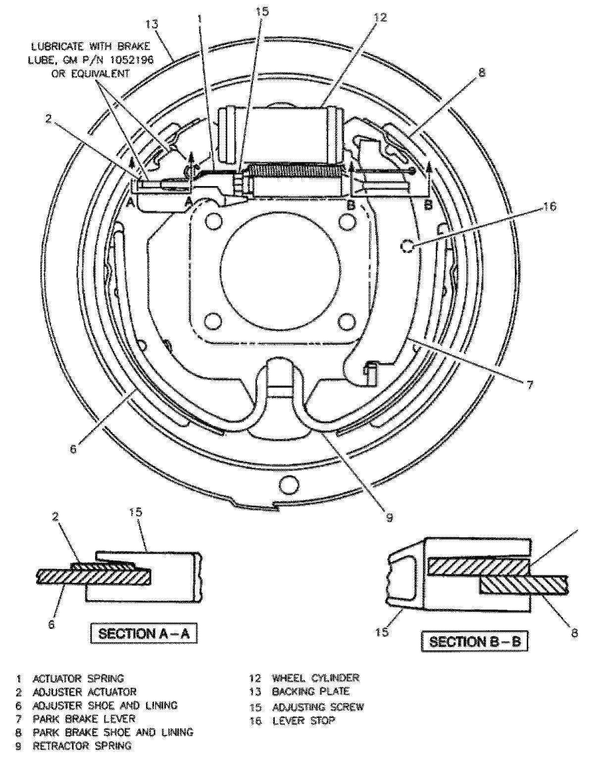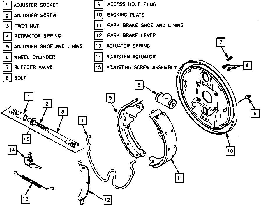 10. Remove adjuster shoe and lining assembly, adjuster actuator, and adjusting screw assembly. Do not remove parking brake cable from park brake lever unless park brake lever is to be replaced.