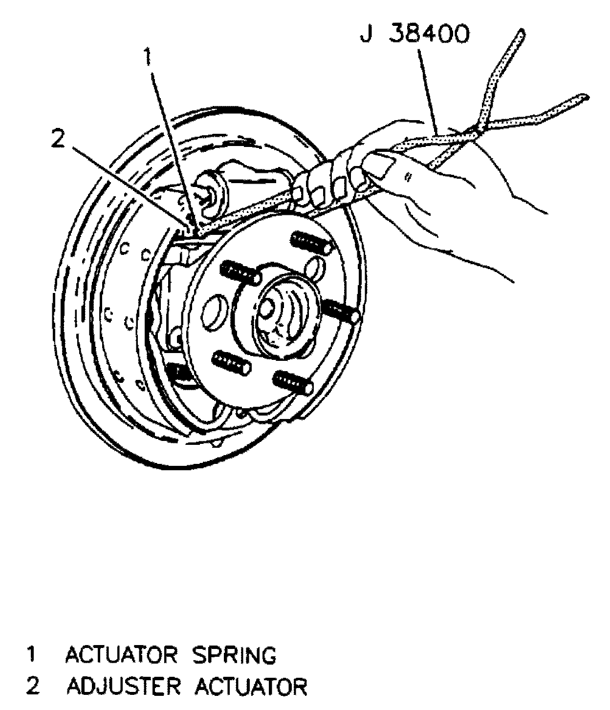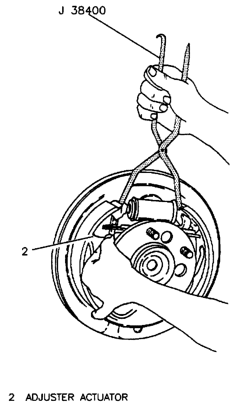 6. Using suitable brake spanner and remover tool No. J 38400, or equivalent, remove actuator spring by prying loop end of spring from adjuster actuator, then disconnect from web of park brake shoe.