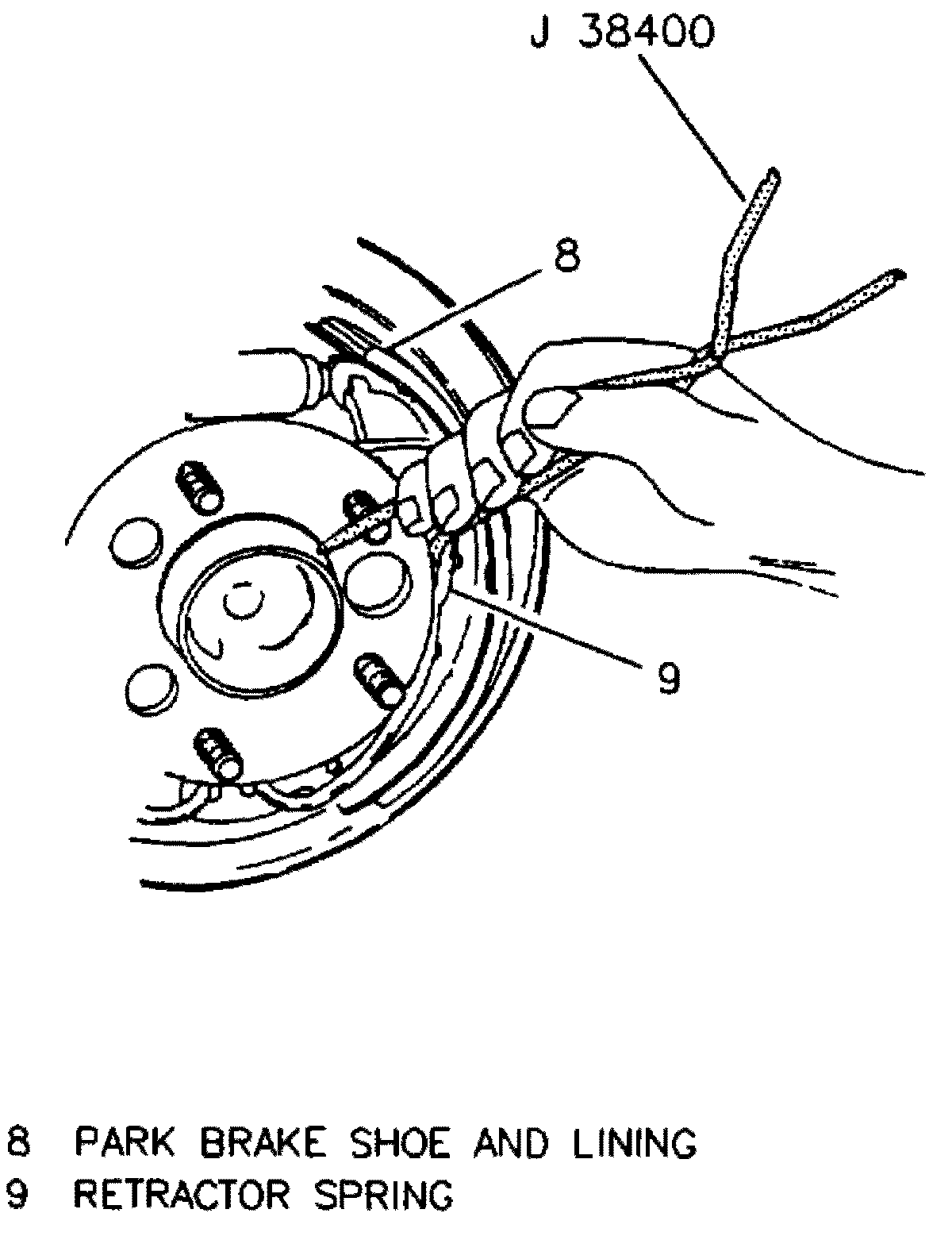 11. Lift end of retractor spring from park brake shoe and lining assembly.