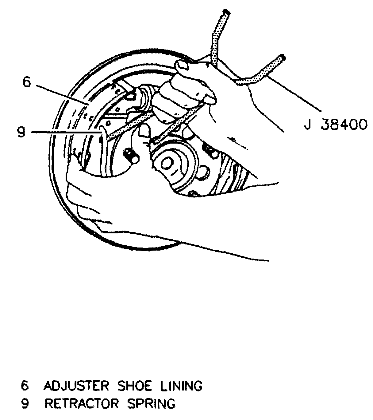 7. Lift end of retractor spring from adjuster shoe and lining assembly. When removing retractor spring, do not overstretch spring, this will reduce its effectiveness.