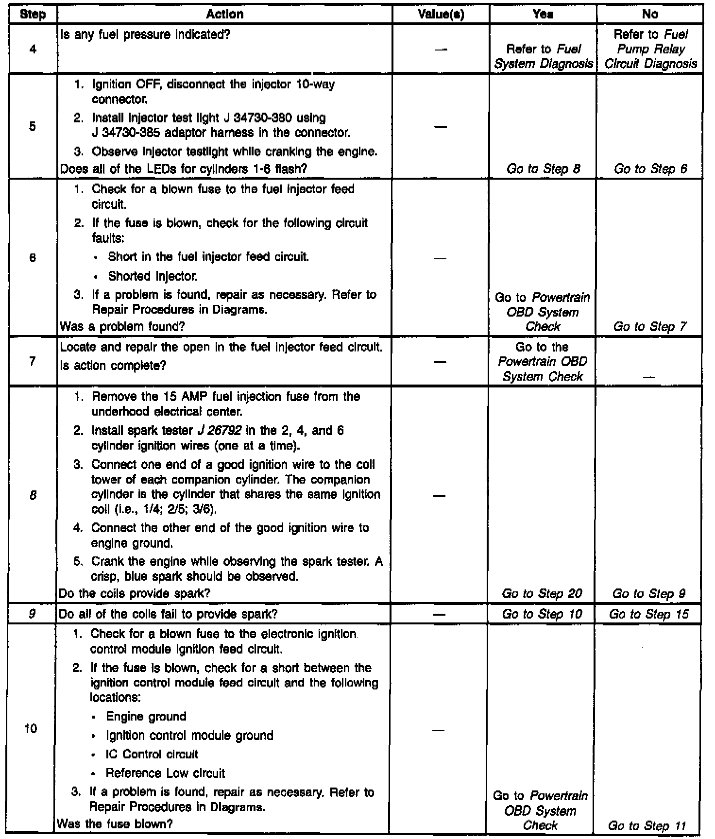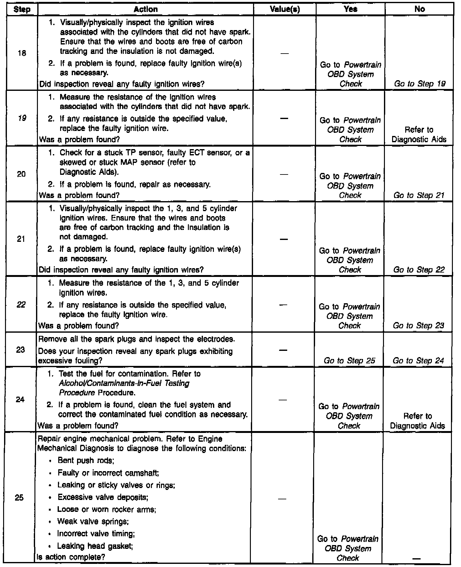 22. Verifies the condition of the ignition wires for cylinders 1, 3 and 5. An open ignition wire results in the loss of two cylinder. A no start may occur especially at colder ambient temperatures.