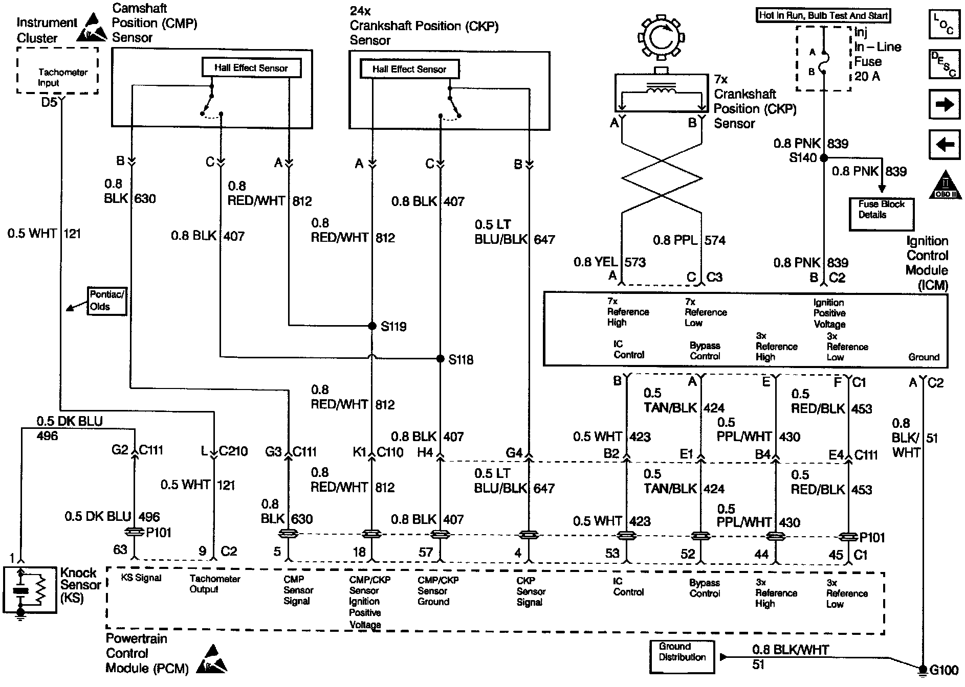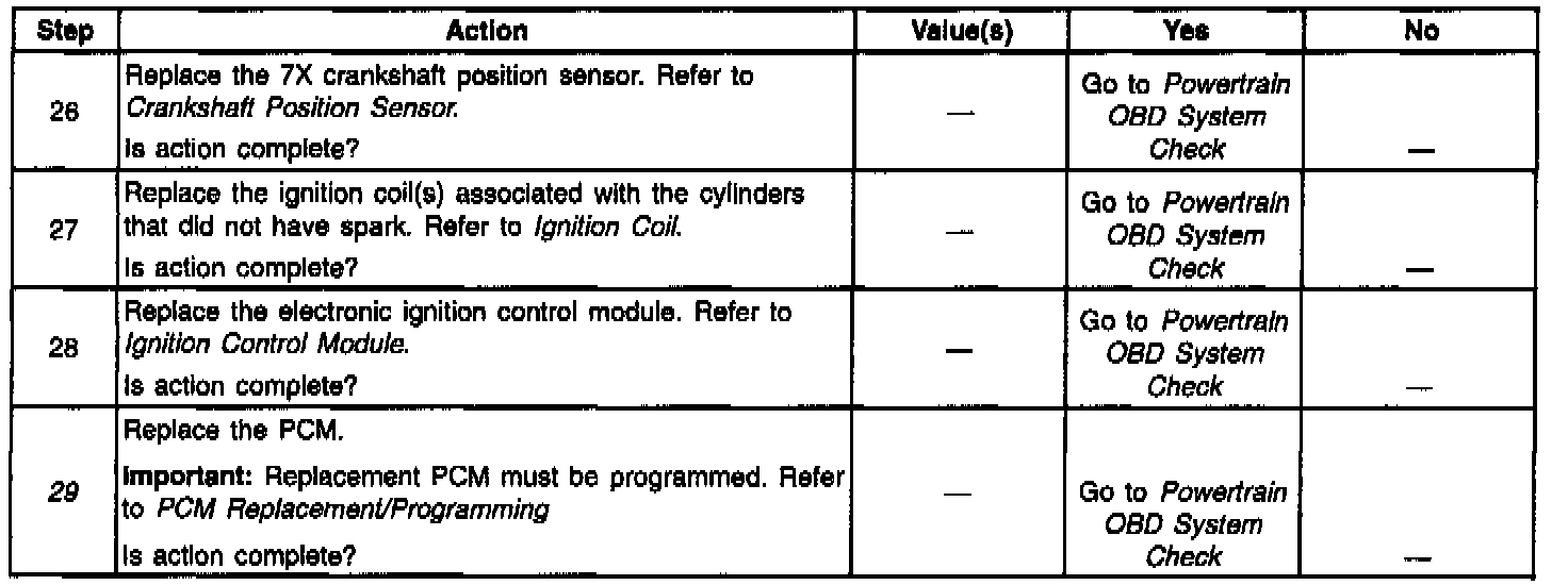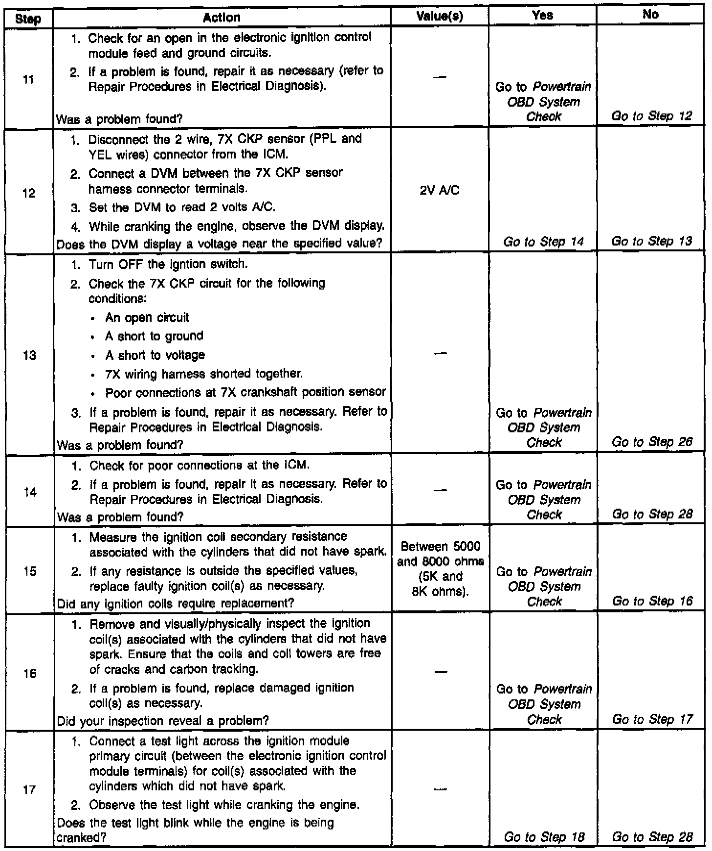 9. No spark from all of the coils indicate a problem with the ignition control module or 7X Crankshaft Position (CKP) sensor.