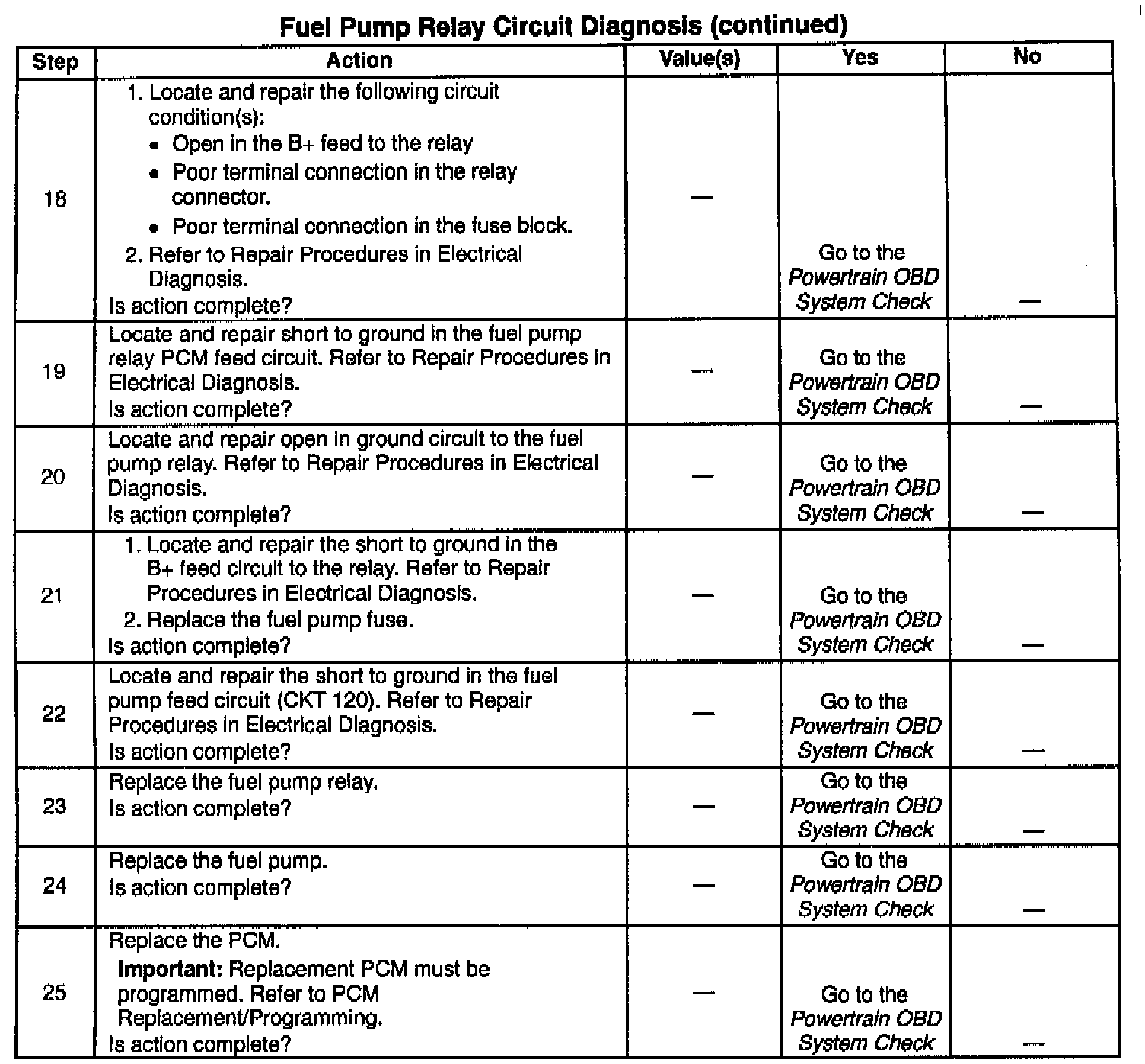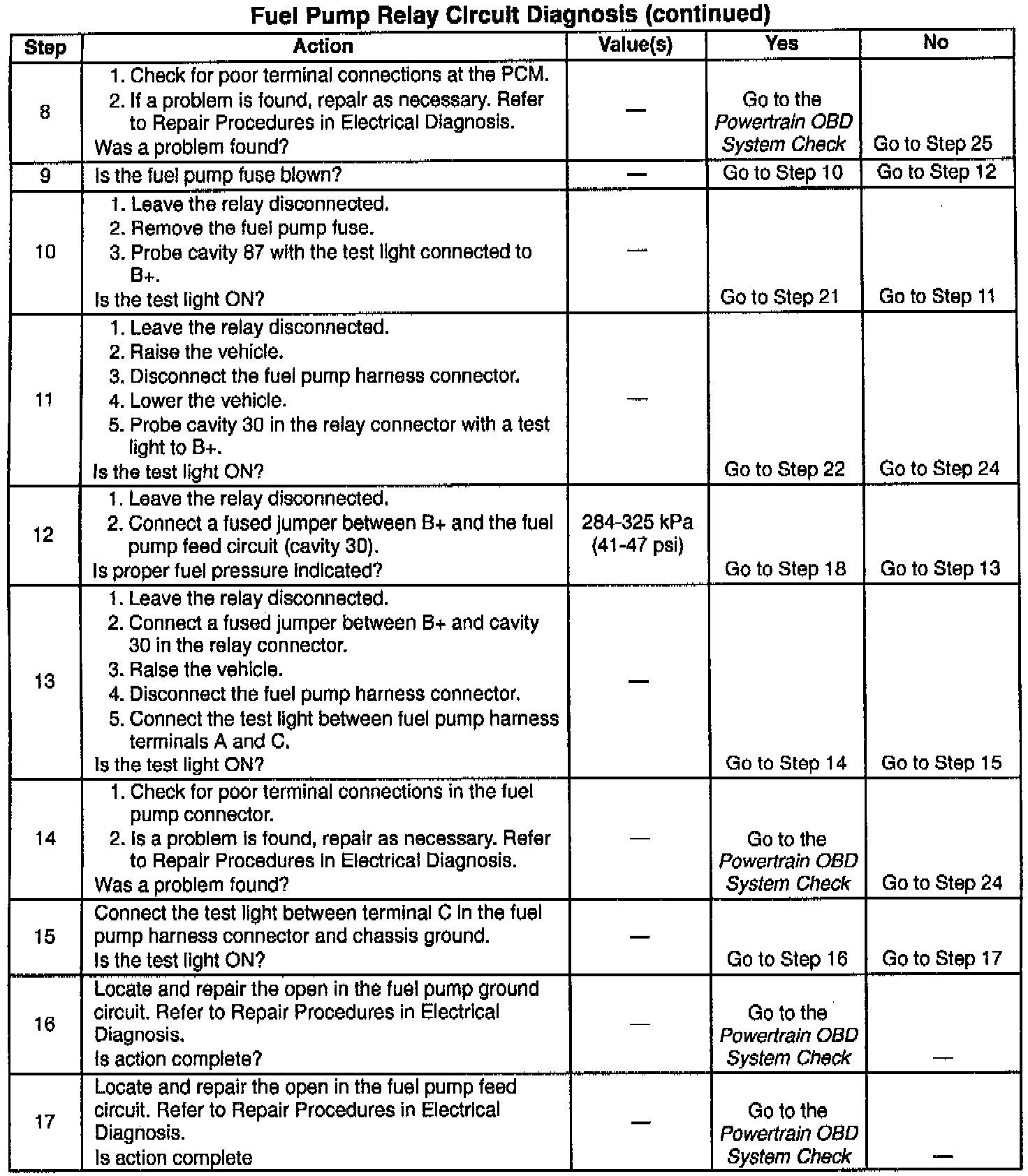 Fuel Pump Relay - Revised Circuit Diagnosis Table