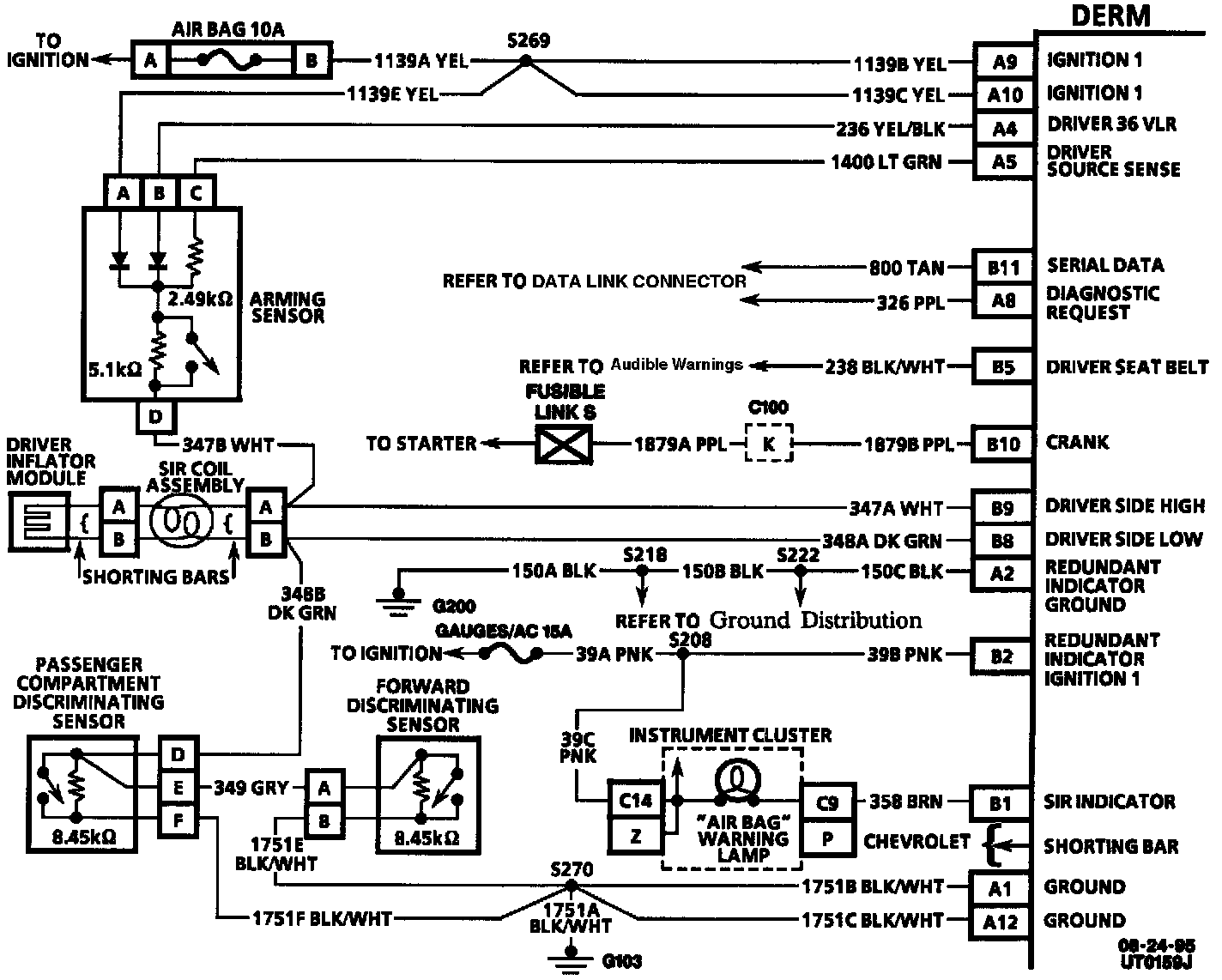 When the DERM recognizes "Ignition 1" voltage, applied to terminals "A9" and "A10," is in the normal operating voltage range, the "AIR BAG" warning lamp is flashed 7 times to verify operation. At this time the DERM performs "Turn-ON" tests followed by "Continuous Monitoring" tests. When no malfunctions are detected the DERM proceeds to the "Initiator Assembly Resistance Test." When a malfunction is detected the DERM sets a current diagnostic trouble code and illuminates the "AIR BAG" warning lamp. The DERM will clear current diagnostic trouble codes and move them to a history file when the malfunction is no longer detected and/or the ignition switch is cycled, except for DTC 51. DTC 51 can only be cleared using a scan tool "Clear Codes" command.