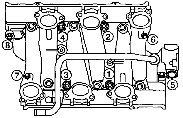 Tighten the lower intake manifold bolts (5, 6, 7, 8) in sequence to 25 N.m (18 lb ft) on the final pass.