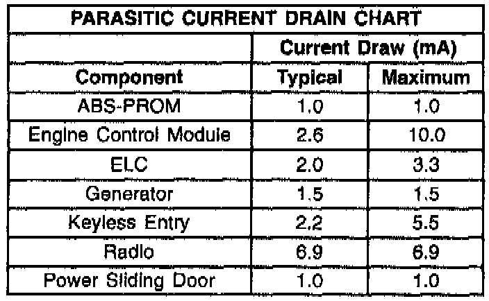 This Parasitic Drain Chart applies to the Parasitic Load Test. Its purpose is to lessen diagnostic time and will also have a positive impact on warranty expense.